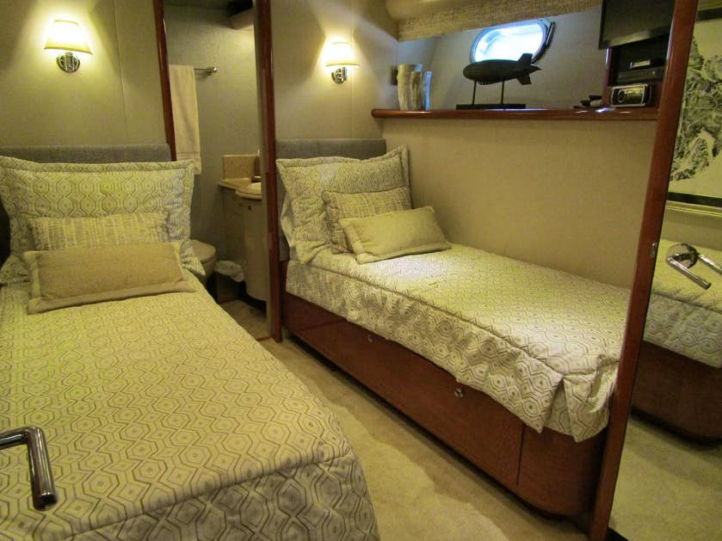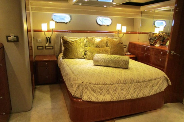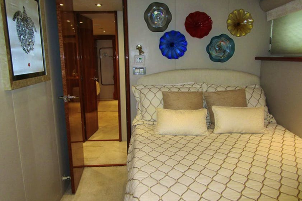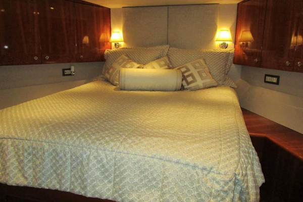 The Master suite is aft in the main accommodation area and entered from the forward end. The walk-around queen size berth is off the starboard outboard bulkhead. The berth has a custom innerspring mattress and twin three drawer cherry nightstands either side with decorative reading lamps above. The headboard is upholstered with two opening portlights above behind fabric blinds. There are four drawers below the berth. Above the berth is a six light fixture mirrored soffit. On the forward bulkhead is a cherry door, auto lit, cedar lined hanging locker and a chest of seven drawers plus the entry door to the cabin. On the aft bulkhead are nine drawers with a wood counter top and mirror over. A shallow full height locker, which contains an emergency escape aft through the engine room, is centered with a ladies vanity with stool outboard. On the port side of the cabin are entrances to the “His and Hers” heads with an entertainment center between. The entertainment center has an LG 32” TV, a Bose sound bar, and a Sony DVD player, a Direct TV receiver, and a Jensen AM/FM/CD player most of which can be hidden behind retractable doors, plus three storage drawers below. Also in the cabin are stereo speakers sixteen overhead LED mini spots, digital A/C controls and a central vacuum outlet plus a dressing mirror on the inside of the entry door.Port Queen Berth