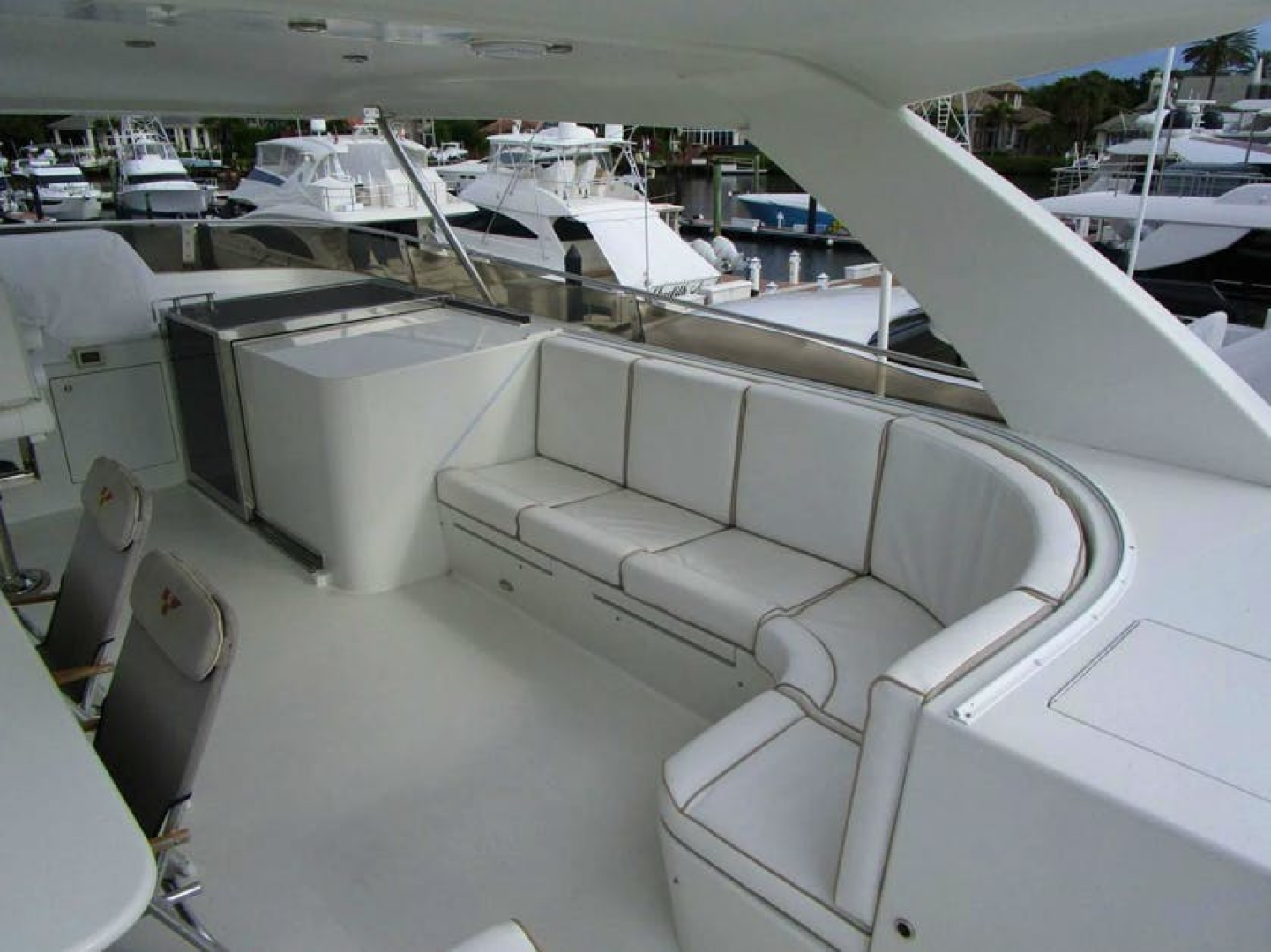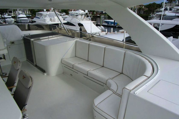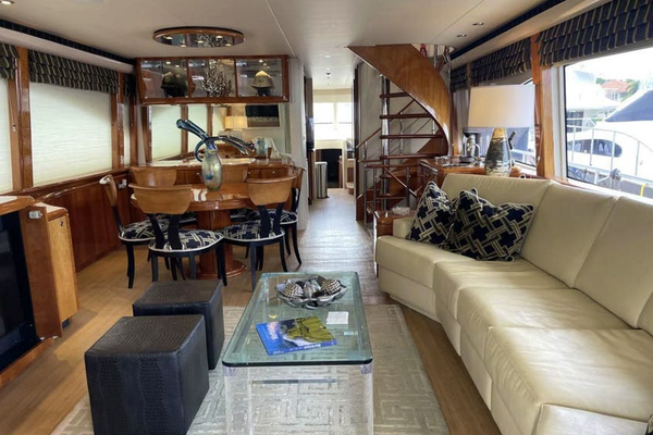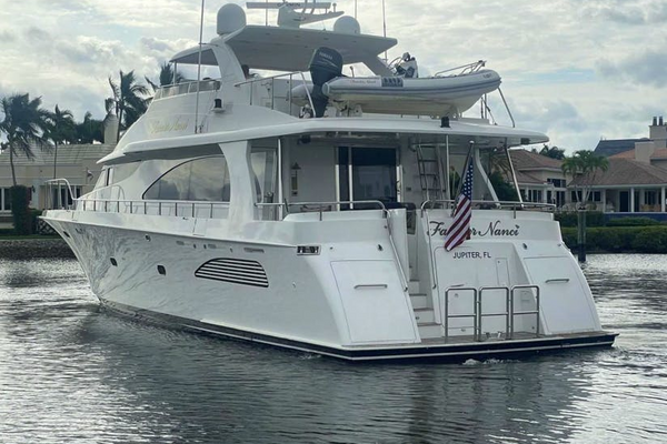 FANCIER NANCI can be boarded from one of four hull side gates via the Marquipt boarding ladder or on to the swim platform from a floating dock. Easy stairs access the aft deck. The aft deck has both fixed and loose seating around a dining table and a ladder to the boat deck. The sliding salon door reveals a large sofa to starboard followed by a wet bar, and circular stairs to above and below. To port starting aft is an easy chair, a large grouping of cabinets for entertainment electronics followed by a six-place round dining table and abundant storage forward. Next forward is the Galley to port and Day Head to starboard. Further forward is the Pilothouse with the lower helm to port and L-shaped seating to starboard. Centrally located are steps to a single Captain’s cabin with a desk, a VIP cabin forward and a large, shared head between. On the lower deck the Master is aft with a queen size berth and his and her heads. Forward are two guest cabins. The port has twin berths and an ensuite head, and the starboard has a double berth with an ensuite head. The Flybridge has interior stairs, a port side helm, two large L-shaped settees with the port side having a fixed dining table. Aft to the boat deck with a grill, storage and a crane for the tender. The large engine room is accessed from the swim platform.Salon