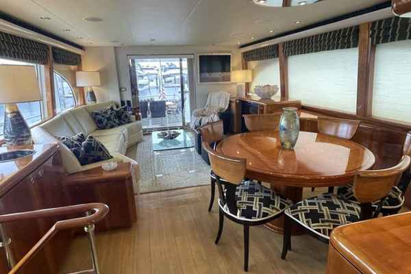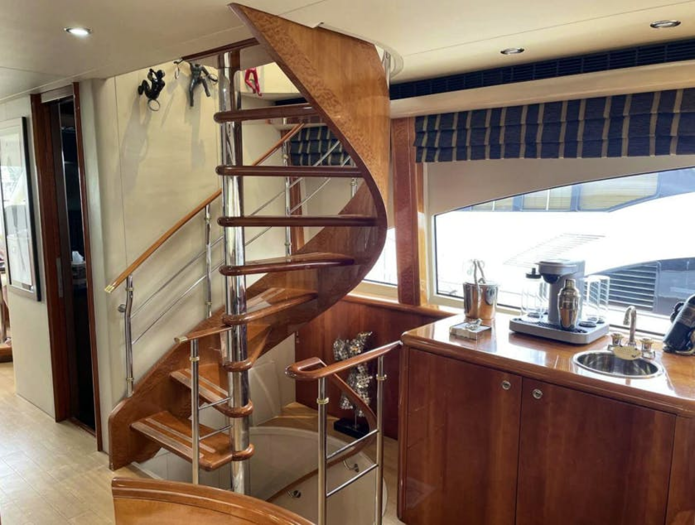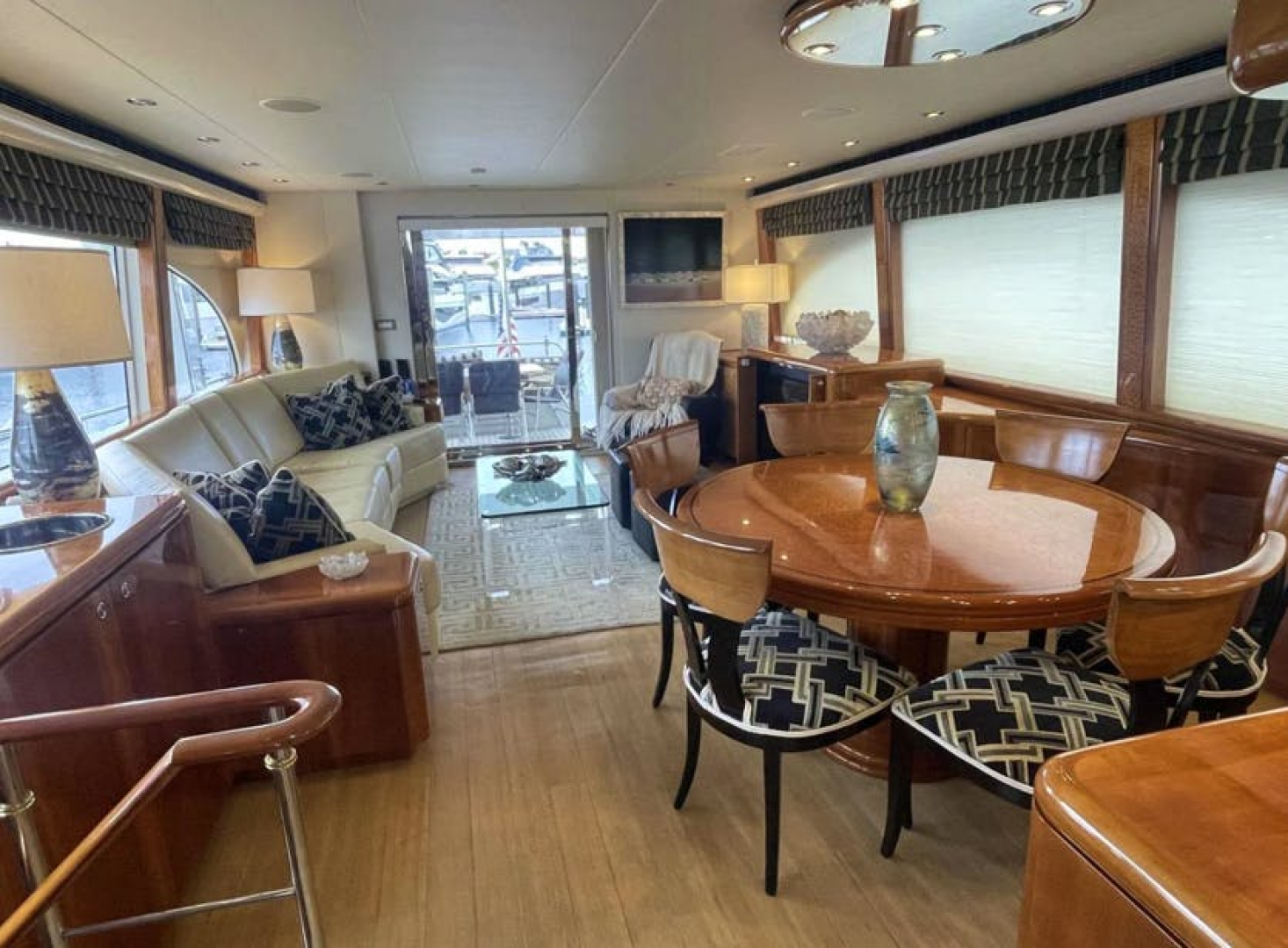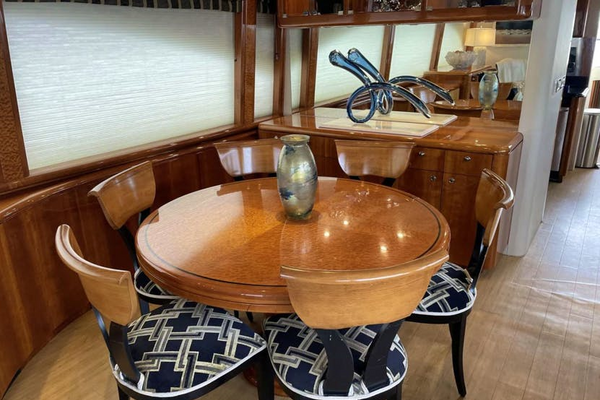 Beautifully appointed, open and airy with excellent views from the large port and starboard windows. The joinery is principally high gloss cherry with Pommele burl accents.