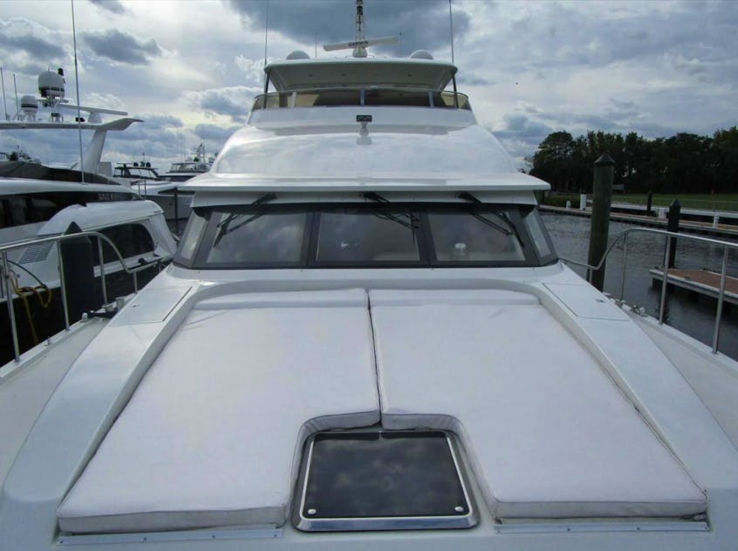 Located just opposite of the queen berth cabin, the twin berth cabin is entered from the aft end with twin berths, one on the outboard hull side, one on the centerline bulkhead of this area. There are three drawers under each berth. Each berth has an upholstered headboard and a reading light above. A shelf above the outboard berth has an opening porthole behind an upholstered valance and Duette shades. At the foot of the berth is a cedar lined auto lit hanging locker with a mirrored door. Between the berths is the entrance to the ensuite heads. Also in this cabin is an entertainment center with an 19” RCA TV, a DVD player and a Sony AM/FM/CD stereo. Also in the cabin are stereo speakers, ample direct and indirect lighting, a carpeted sole and digital A/C controls.Foredeck and Side Decks