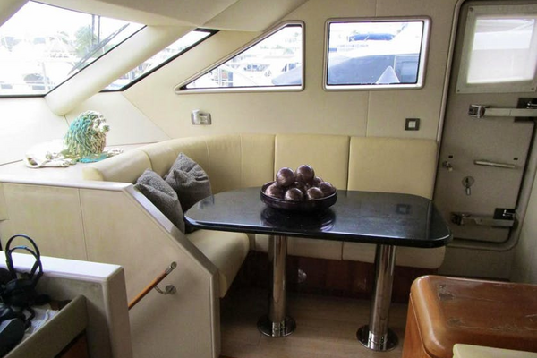 Forward of the Day Head is a raised L-shaped settee with light tan ultra leather. A black Avonite table on a double pedestal seats four comfortably. The dinette can double as a navigation work area, if needed.Outboard are port and starboard Pantograph doors to the wide side decks. Just aft of the dinette are two pantry doors.