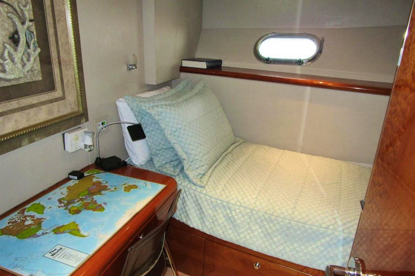 The single berth cabin is suitable for a captain/mate or guest if an owner operated the vessel. The generous single berth is outboard with a storage below. Above the berth is an opening stainless steel porthole, below are two storage drawers. Inboard is a five drawer desk. Forward is a cedar lined auto lit hanging locker. This cabin has its own digital A/C controls, overhead lights and carpeted sole.Forward VIP Cabin