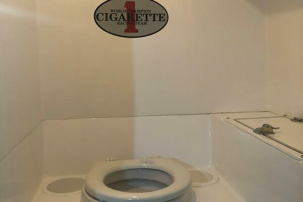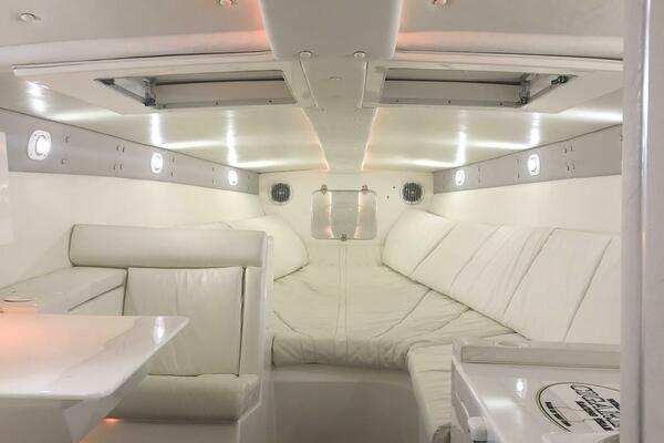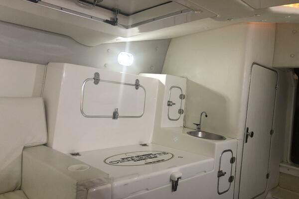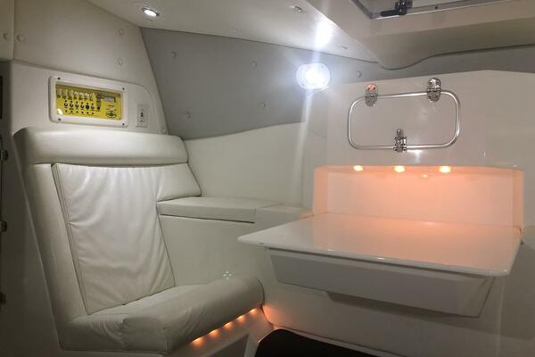 Below you have amenities to spend a weekend away at a favorite destination. A seating area with a table for a quick bite to eat, and a sink wo wash up after. A single head toilet. Forward in the bow is a full tapered berth and ample lighting throughout.