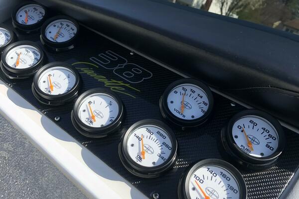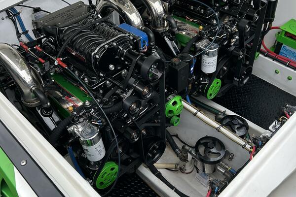 Powered by precision: beneath the deck, twin Mercury Racing HP700-EFI engines provide serious thrust—each professionally rebuilt from top to bottom in 2024 by Saris Performance Marine and retrofitted with Whipple superchargers for a staggering 700 hp apiece. With just 20 hours of post-rebuild run time, these motors are tuned for years of spirited, worry-free boating. Out back, the Integrated Transom System enhances control and stability via hydraulic steering rams and extension boxes—allowing for higher drive placement and reduced drag. In short: it's engineered for precision at speed.