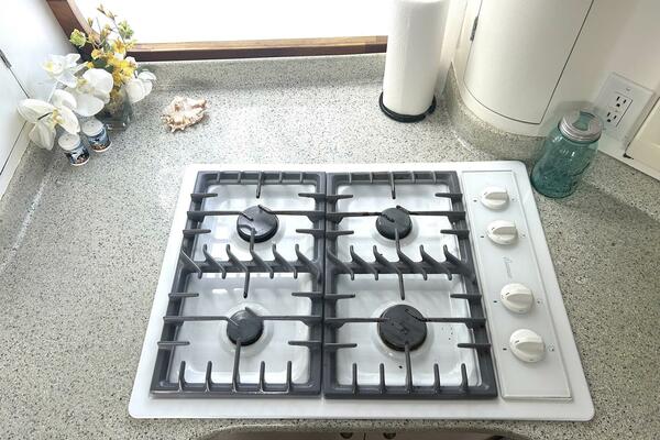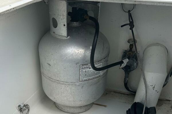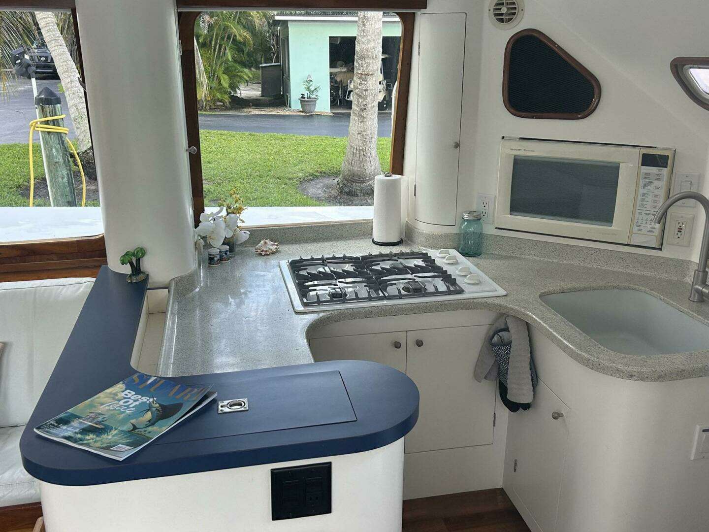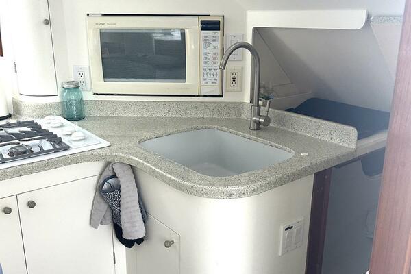 The Galley is open to the main salon with convenient access to the aft deck, a very popular seating and eating area. It stretches full width port to starboard with the full size refrigerator on port and the large sink with four burner propane stove on starboard. There is a microwave/convection oven in a dedicated cabinet and storage everywhere.