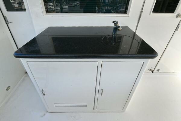 The galley adjoins the salon and has a raised bar-style two level granite counter with glass-front display cabinet. In addition, there are cabinets above this counter with LED lighting and extra storage for essentials. The galley is very complete with a new Frigidaire refrigerator/freezer/icemaker, trash compactor, full-size dishwasher, 4-burner GE glass stove top, Advantium oven, double stainless-steel sink with garbage disposal, and an easy pass-thru to the pilothouse area. There is a large on-deck day head as well. Just forward of the head is a very large pantry built-in under the staircase. For night-time running, there is an additional door between the pilothouse and galley.