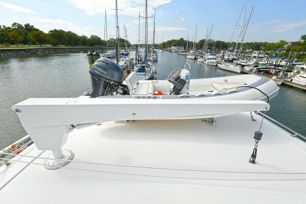 A comfortable staircase leads to one of the largest flybridge areas ever found on a 60' to 70' yacht, as it utilizes the entire area above the main cabin house in the traditional style of Burgers and DeFevers. There is a center helm position with electronics, other controls and two Pompanette chairs with covers. There is a large section of built-in seating to port, custom fiberglass storage lockers, and to starboard is a fiberglass cabinet with built-in icemaker, sink and stainless-steel barbecue grill with additional storage below. The area furthest aft houses a low-rise 1,000 lb. davit and a 12' Novurania dinghy with a new fuel injected 40hp Yamaha 4-stroke outboard. After several design changes during the construction of this yacht, the radar arch was hinged and designed to lower and allow a total clearance of 17' 3". This will allow the yacht access to the Great Lakes or Great Circle Route.