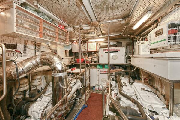 Continuing forward is a walk-in engine room with approximately 7 feet of headroom, custom stainless-steel railings around the main engines, and a custom ladder to an escape hatch above. Both generators are housed in this area. Other equipment includes stabilizers, inverter, battery systems, other charger systems, custom work bench, custom tool storage cabinetry, central vacuum system and water pressure systems. The entire area has upgraded insulation on the walls and overhead. In 2005, the owner upgraded the blower and exhaust fan systems for the engine room and added a fuel polisher.
