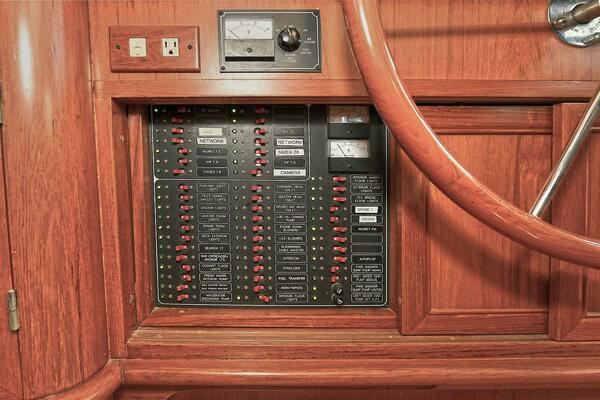 Forward is the pilothouse with an L-sectional area offering comfortable seating with a table, overhead LED lighting, and reading lights. Heavily built watertight doors with teak paneling are both port and starboard. There is a Stidd helm seat appropriately positioned at the navigation station. A custom console was created to maximize space for a very complete electronics package, including a monitor for the camera system, bow and stern thruster, and tank levels. This yacht has been upgraded to twin disc controls in the Fall of 2003. Both 110/220V electrical panels and 12/24V panels are in this area, along with exceptional storage including chart storage.