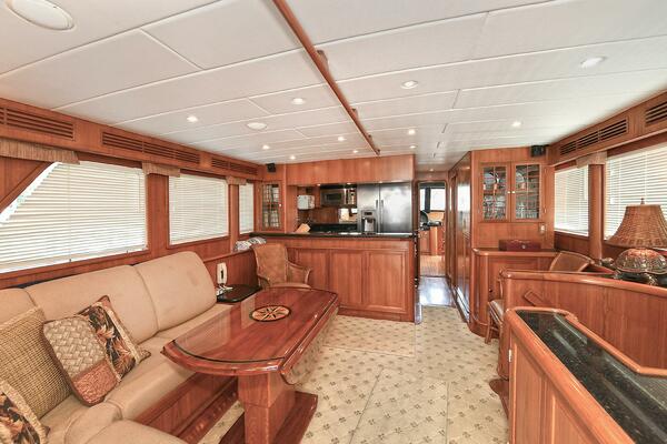 From the aft deck there is a double door entrance through very heavily built doors to a salon with adjoining galley. Carpeting, inside the specially built teak floor border, and there are custom window blinds and curtains, additional LED lighting, granite ledges with large teak burl to starboard, and comfortable L- shaped built-in seating with granite topped end table to port. Two additional chairs provide for comfortable dining around a new custom circular hi-lo table. The air conditioning outlets in the salon are on both sides in the valances producing a more effective air flow. There is a private staircase in the salon to access the master stateroom, laundry area and engine room below.