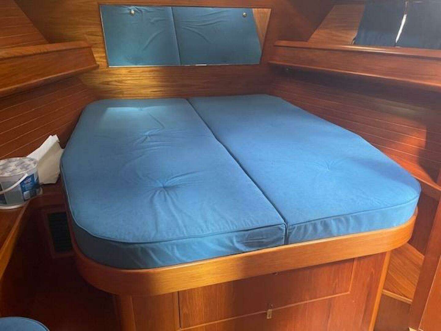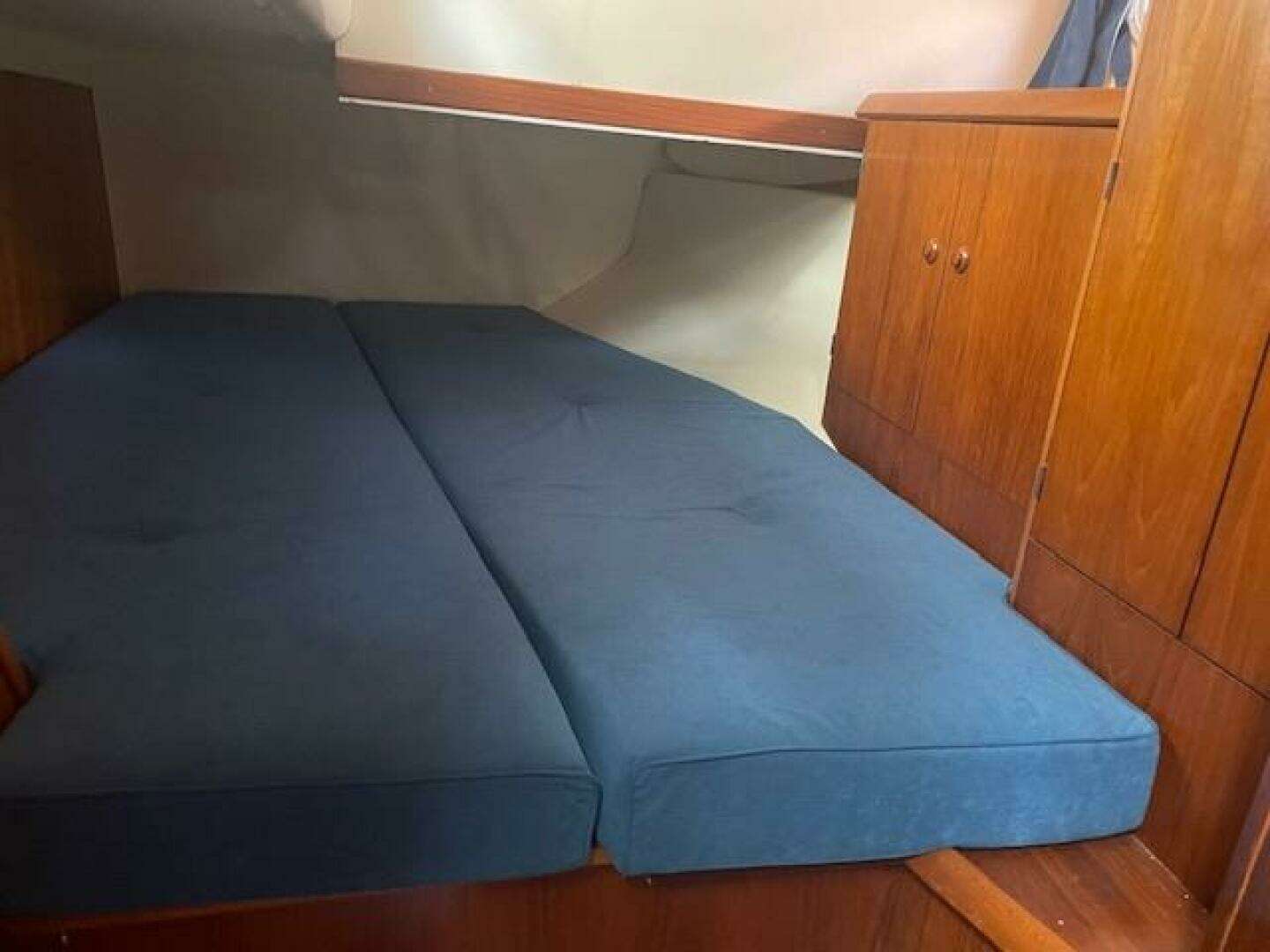 Stepping down the companionway ladder from the cockpit, you will see a guest head with a shower to port. The galley isforward to port, with a navigation station to starboard aft, followed by a wrap-a-round dinette to starboard. Foreward ofthe galley is the Master cabin, featuring a large ISLAND QUEEN-SIZE bed with an ensuite head and separate shower. Aft of the salon are two double berths to port and starboard, each with two drawers and a closet.