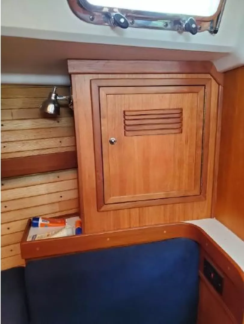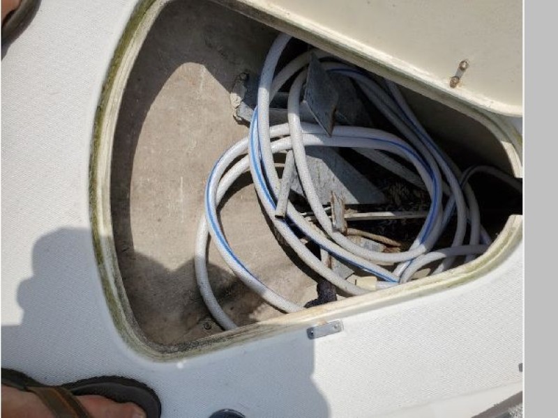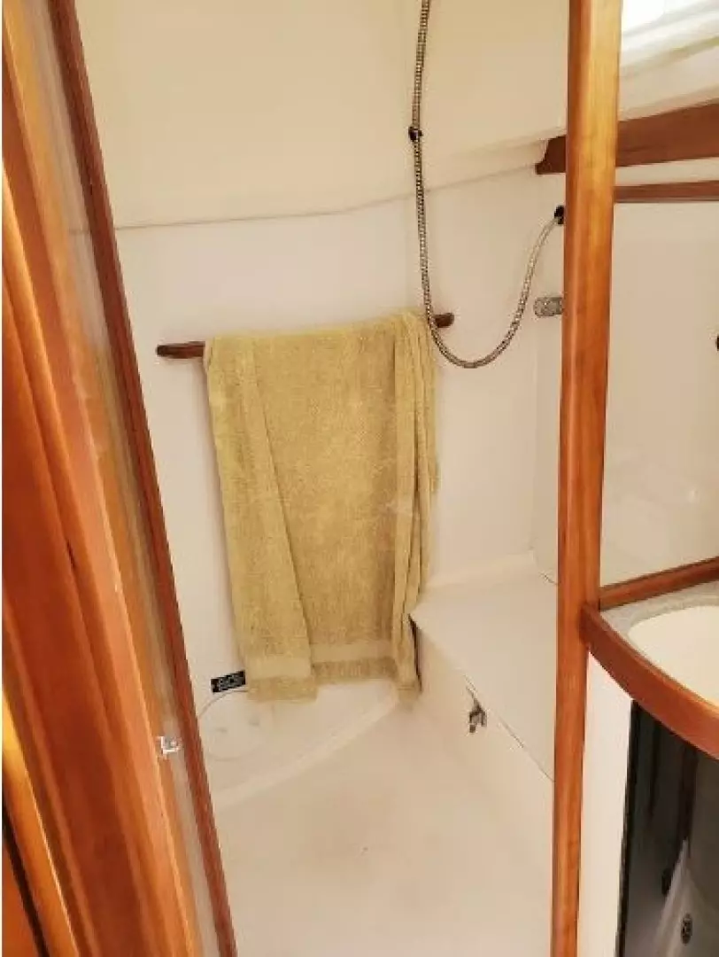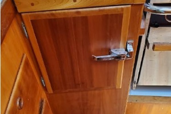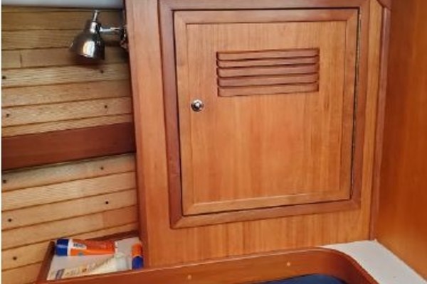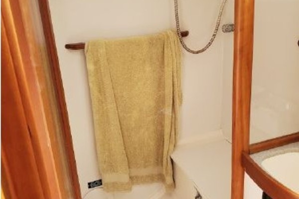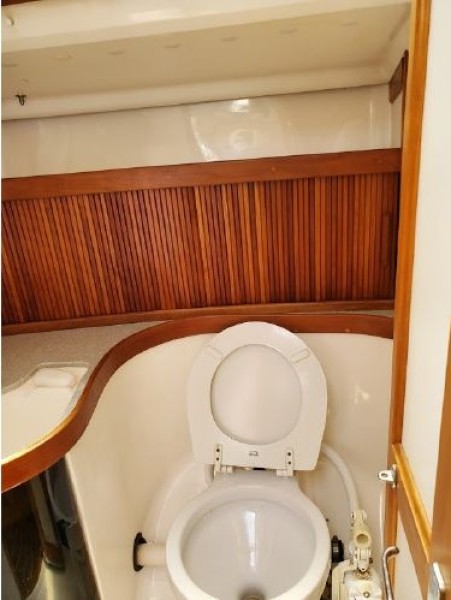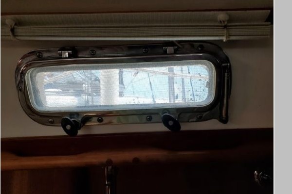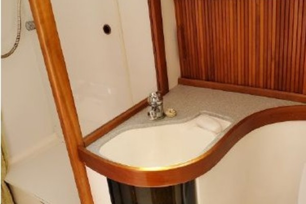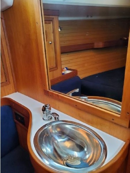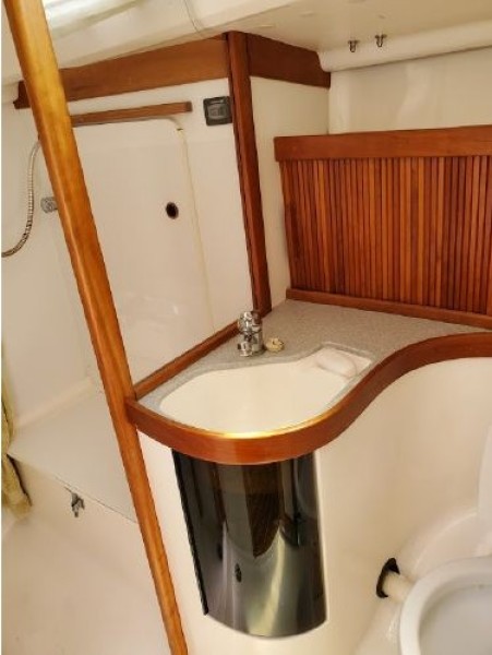 The ample galley features top and front loading ice box with refrigeration. Propane stove with oven. Double stainless steel sinks with hot and cold pressure water and manual hand pumps. Plenty of storage for dry goods and cooking essentials. The large head is to port and features a separate shower stall and hanging wet locker. Ventilation is supplied by numerous stainless steel opening ports with screens as well as new Lewmar hatches also with screens.