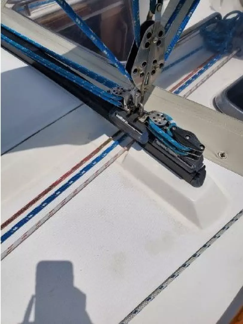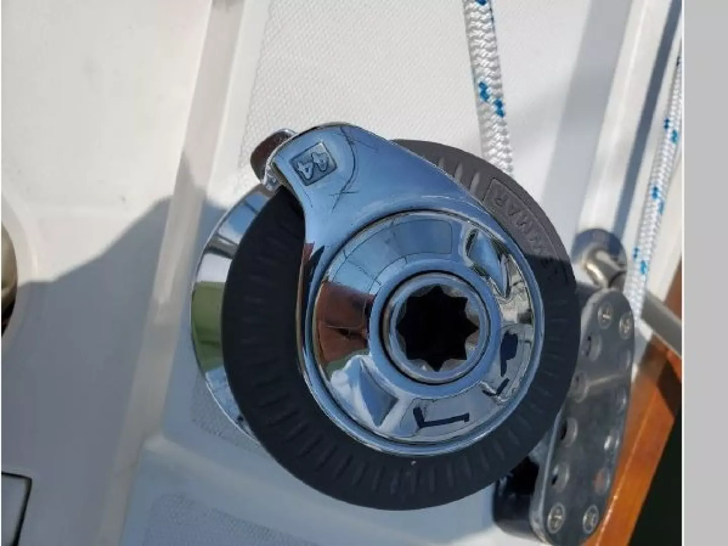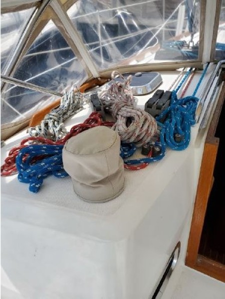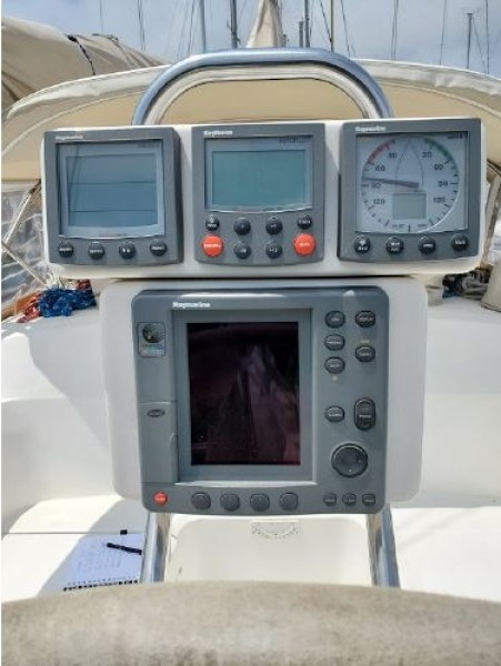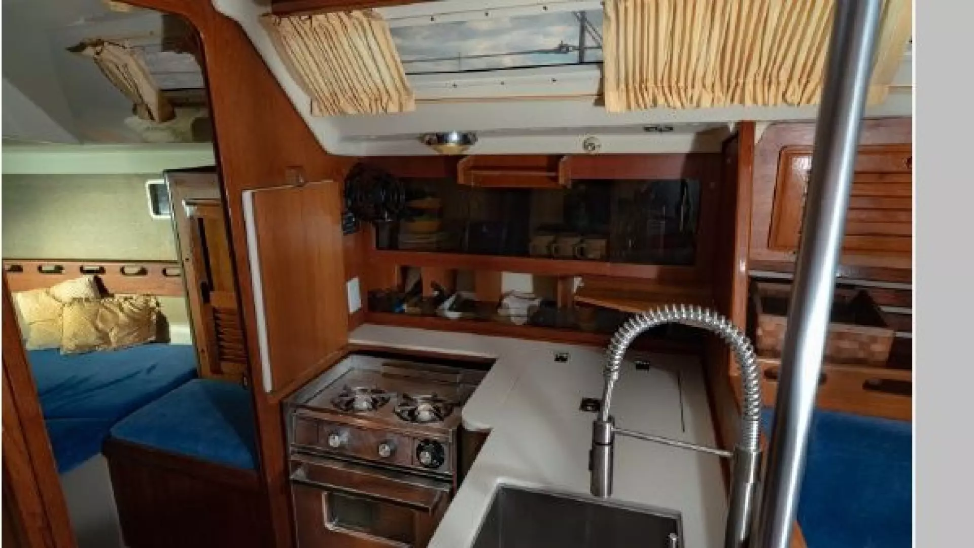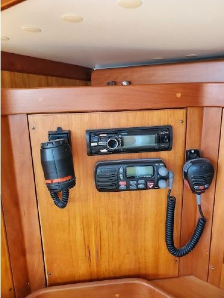 The ample galley features top and front loading ice box with refrigeration. Propane stove with oven. Double stainless steel sinks with hot and cold pressure water and manual hand pumps. Plenty of storage for dry goods and cooking essentials. The large head is to port and features a separate shower stall and hanging wet locker. Ventilation is supplied by numerous stainless steel opening ports with screens as well as new Lewmar hatches also with screens.