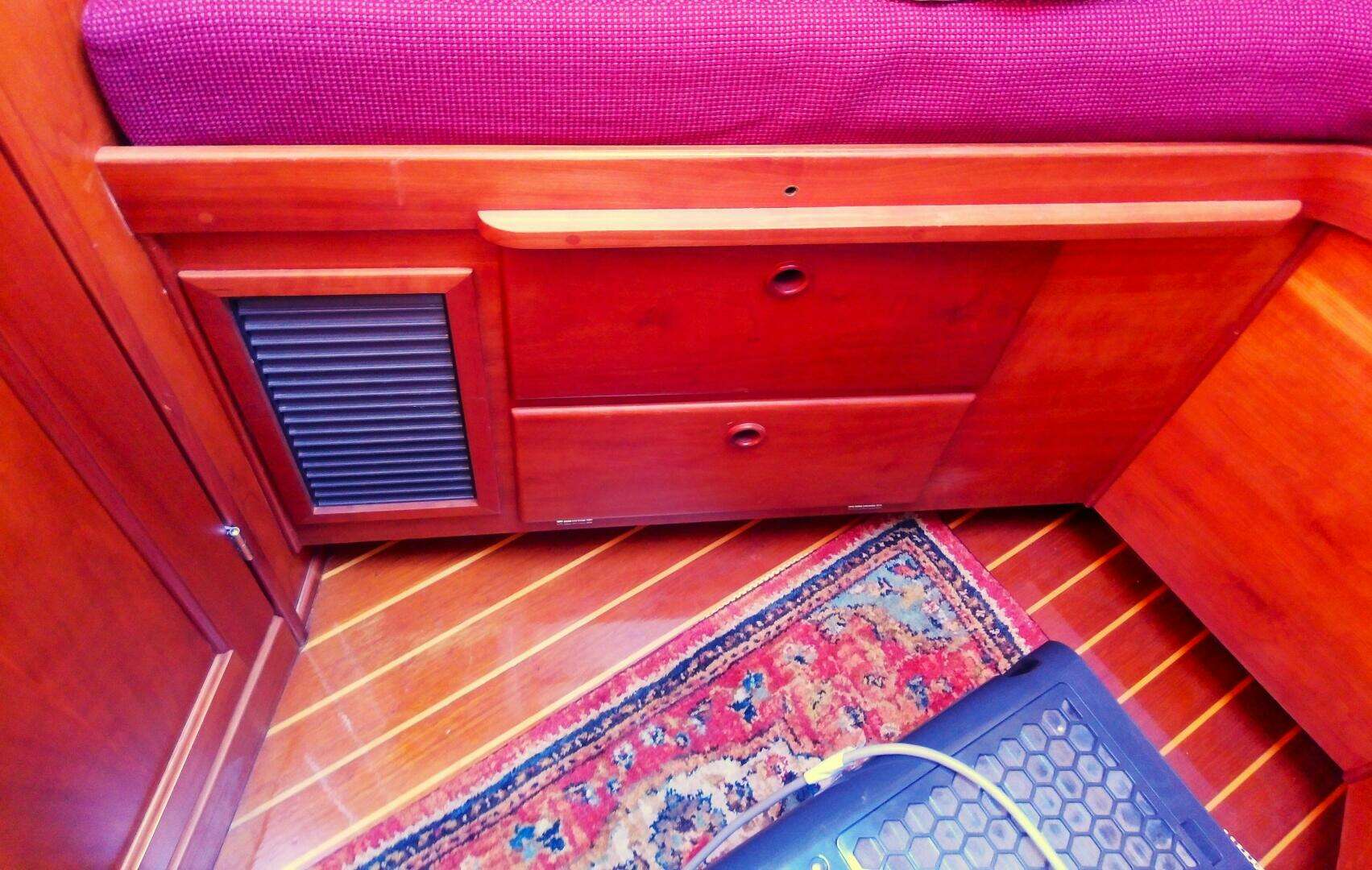 - Private Forward Stateroom w/ large V-Berth, Storage and built In Drawers, Large Handing Closet, Marine Air Conditioning Access, Private entry to Head Compartment
