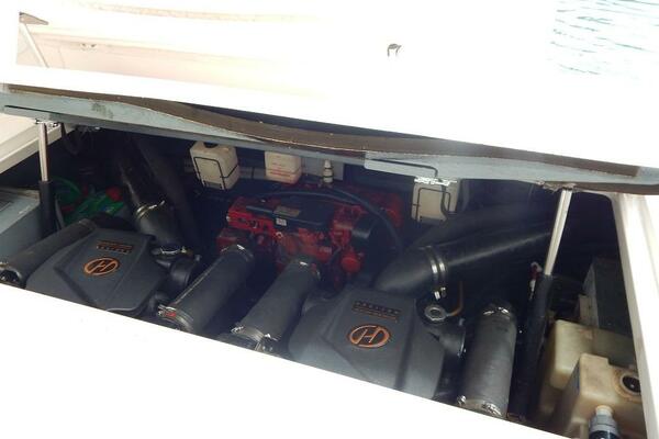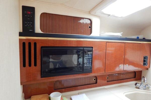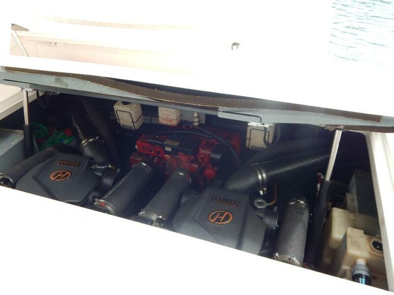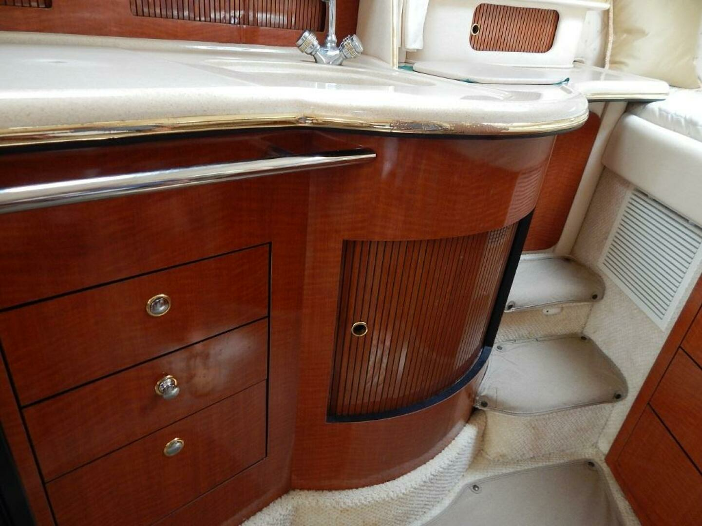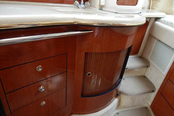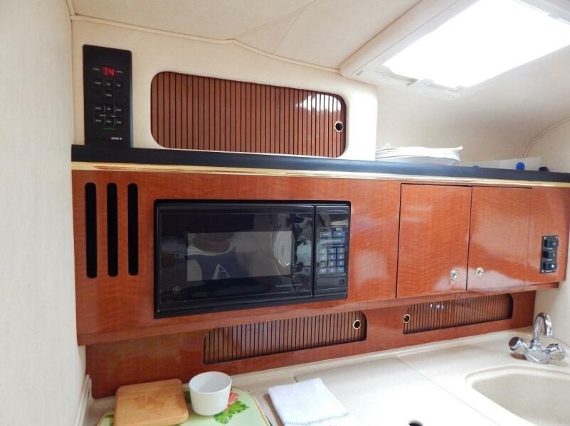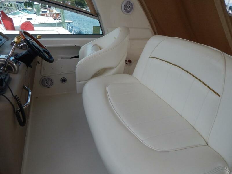 There are 3 overhead hatches and 4 opening ports for ventilation, carpeted sole with protective covers and ultraleather interior cushions. The cabinetry is figured dark wood veneers.