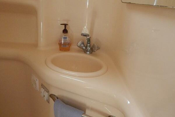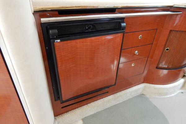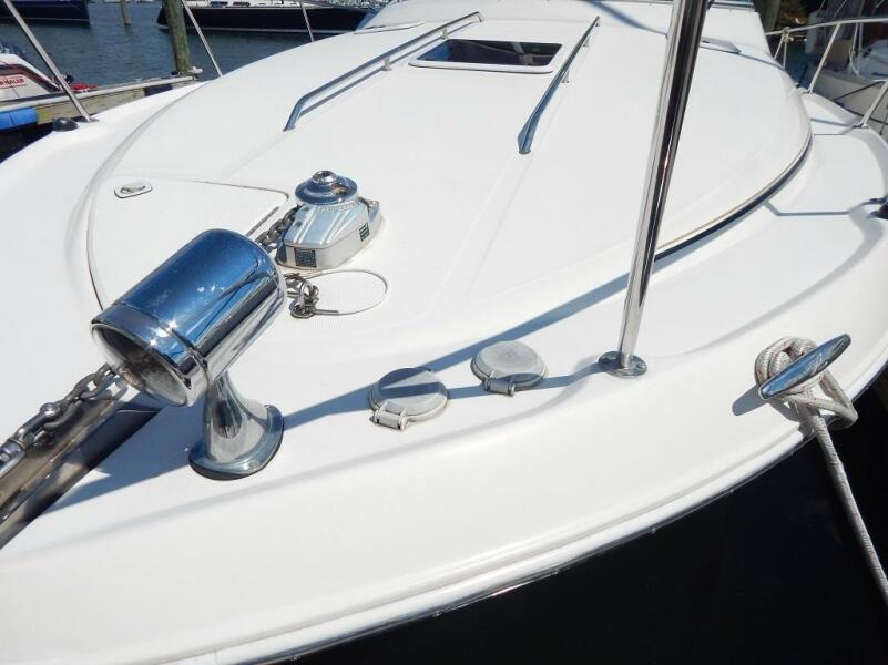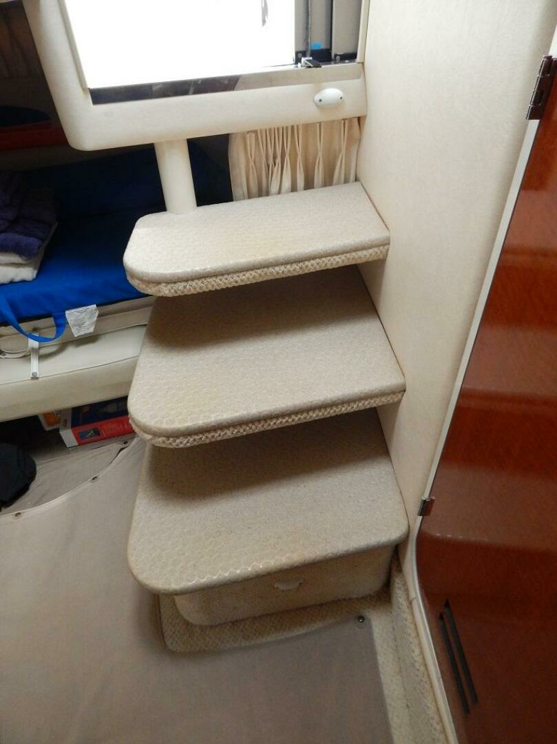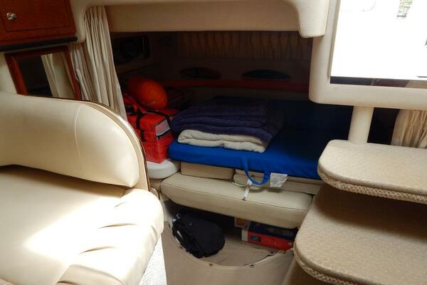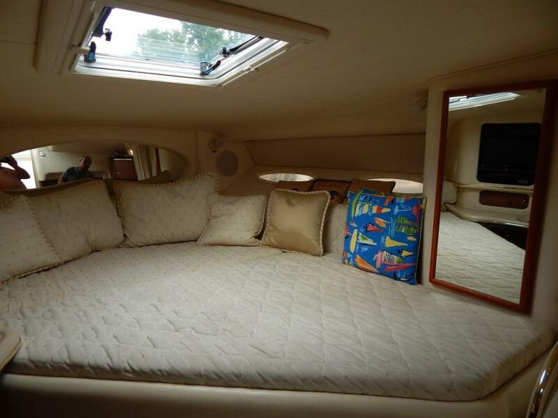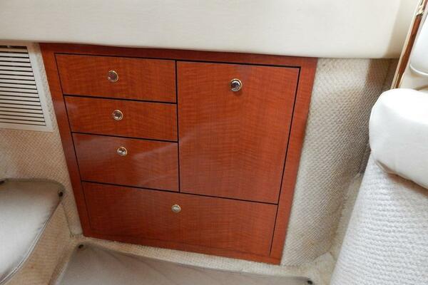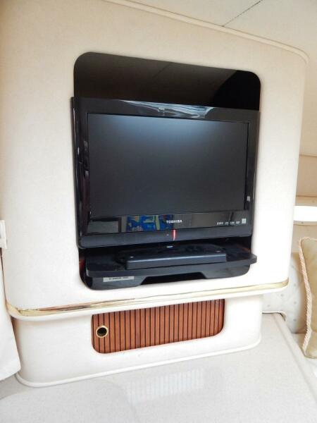 Furthest forward is a offset double berth with storage shelves outboard, a hanging locker and drawers underneath, there is a television to port with steps to the berth below. Next aft to port is the galley with overhead and under counter storage to starboard is the convertible dinette with outboard storage, Next aft to port is the enclosed head and to starboard is the elecrical panels. furthest aft is the large midcabin with U-shaped settee converting to a double.