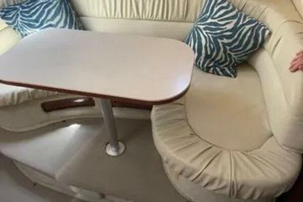 The 2002 Sea Ray 340 Sundancer is a 36-foot express cruiser with a fiberglass deep-vee hull and a spacious interior. It's known for its luxury accents, including a cherry wood interior, neutral tone fabrics, and a large stateroom with ample storage space. The boat also has a full-service galley, cockpit wet bar, and cockpit refrigerator. Luxurious accents like high-gloss cherry cabinets, faux leather upholstery, and quality hardware and appliances set the 340 apart from most of the competition. Roomy open-plan interior with large galley, sunken mid-cabin area sleeps six. Note pull-out TV above the galley. Built on a solid fiberglass hull with an integrated swim platform and moderate 11'5" beam. Cockpit features include a removable rear bench seat, wet bar with sink, built-in ice chest, cocktail table, and companion seat with storage under. Power engine compartment hatch is a nice touch.
