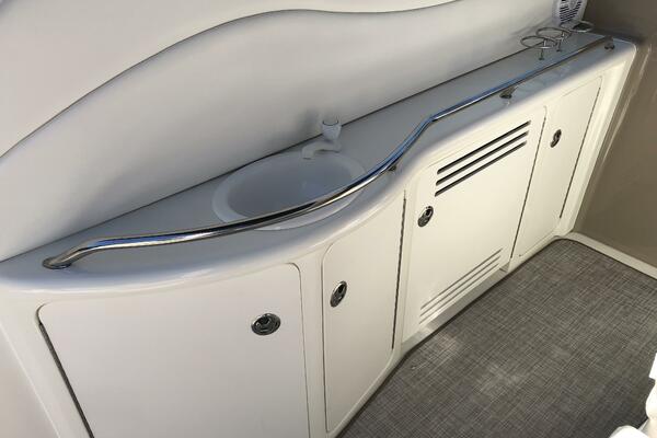 The 360 Sundancer was a cutting-edge boat in her day with great exterior styling and luxury-class amenities. She has a comfortable and attractive interior layout, sleeping for 6 and plenty of storage. The head compartment features a full fiberglass shower with curved acrylic doors. Outside, the spacious cockpit has a wet bar and abundant seating. Engine access is excellent as the entire cockpit floor rises to completely expose the engine compartment.