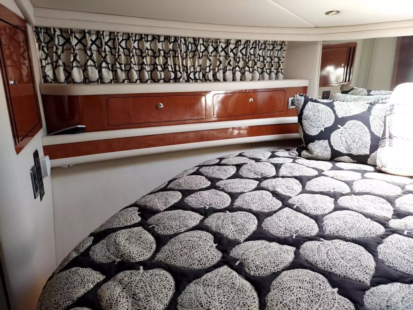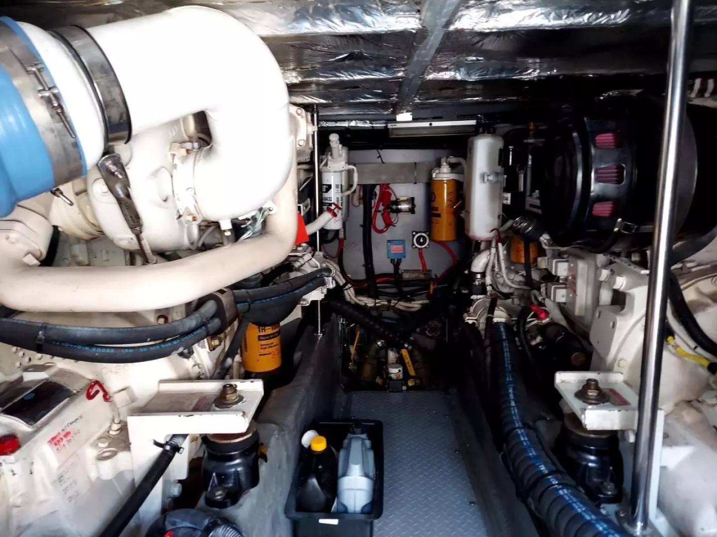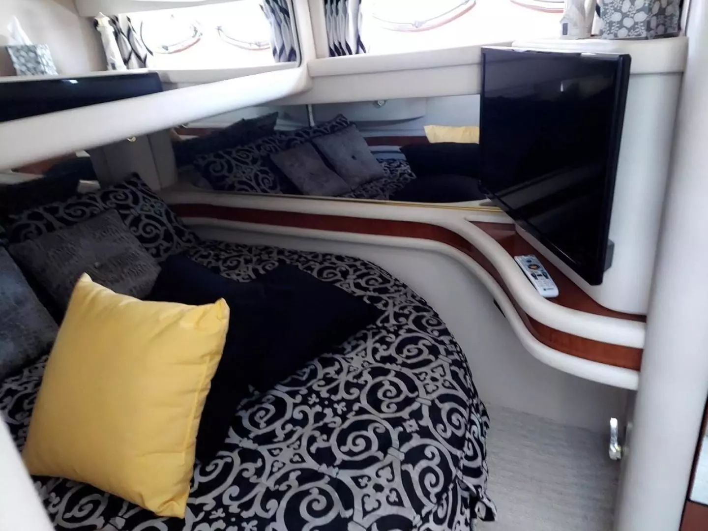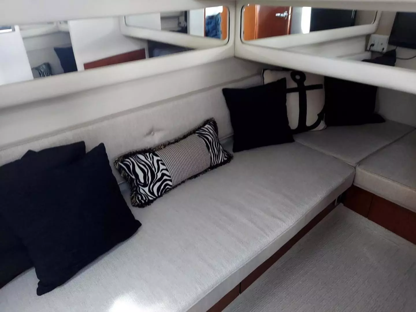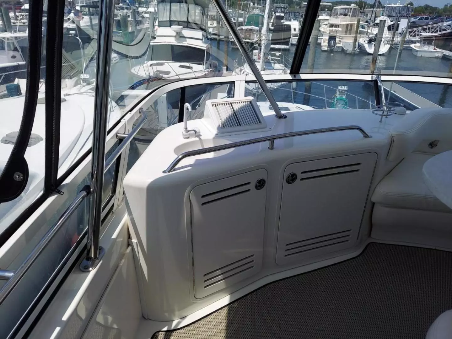 The master stateroom is forward with a ventilation hatch, hanging lockers port and starboard and storage underneath. Aft to starboard is the master head with vanity, mirror and a separate stall shower. Aft again to starboard is the second stateroom with crossover berths for sleeping or a seating area. Aft to port is the day head with vanity, mirror and a separate seal shower. Aft again to port is the VIP stateroom with a queen bed, hanging locker and TV. Up a couple of steps to the salon area you have a full dinette area followed by an L-shaped sofa with storage underneath that electronically converts to a bed. To starboard you have a spacious galley area followed by a barrel chair and a Hi-Lo table. Amtico flooring in the galley area and main salon.Out to the cockpit area with a couple of deck chairs, transom bench seat and a transom door to the swim platform. Up a stairwell to the flybridge you have a center helm with a companion seat. Forward of the helm you have u-shaped seating with a large table and wet bar to port.