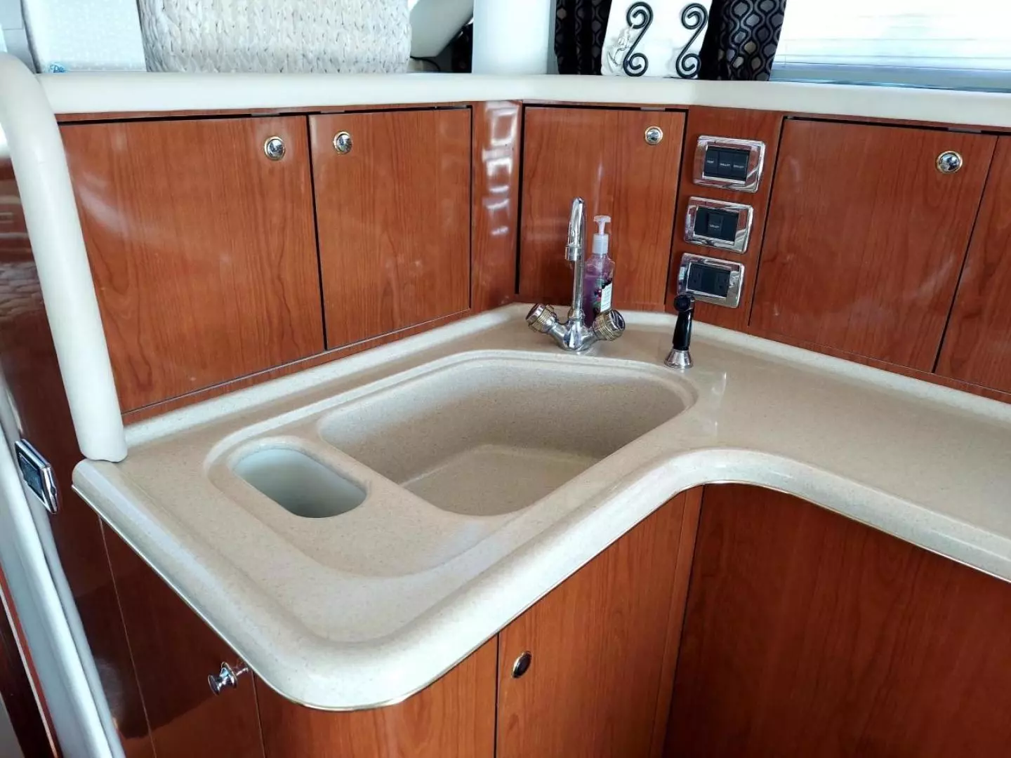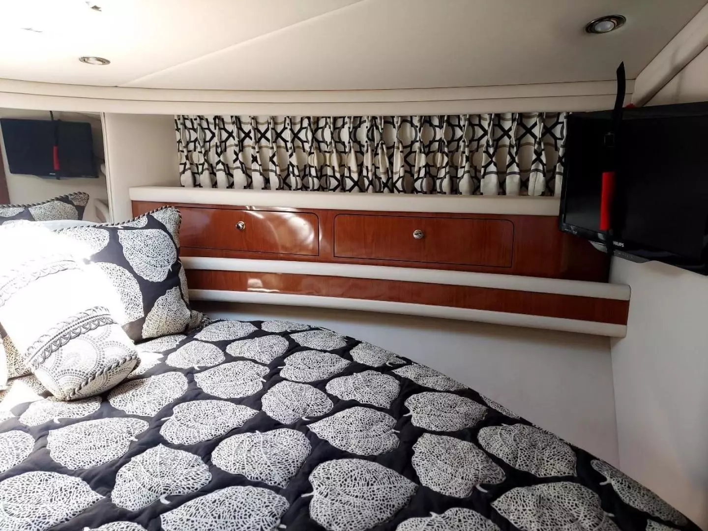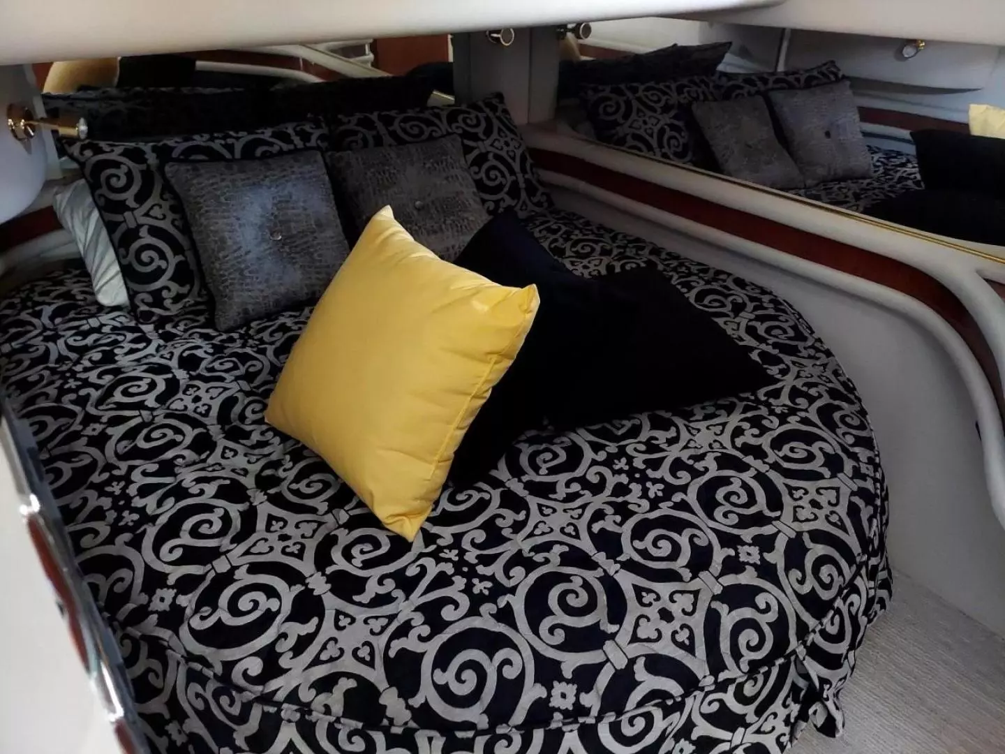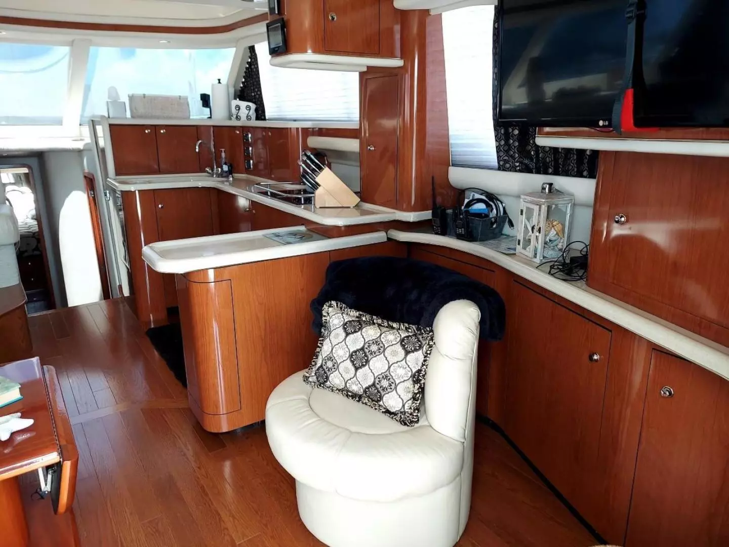 The master stateroom is forward with a ventilation hatch, hanging lockers port and starboard and storage underneath. Aft to starboard is the master head with vanity, mirror and a separate stall shower. Aft again to starboard is the second stateroom with crossover berths for sleeping or a seating area. Aft to port is the day head with vanity, mirror and a separate seal shower. Aft again to port is the VIP stateroom with a queen bed, hanging locker and TV. Up a couple of steps to the salon area you have a full dinette area followed by an L-shaped sofa with storage underneath that electronically converts to a bed. To starboard you have a spacious galley area followed by a barrel chair and a Hi-Lo table. Amtico flooring in the galley area and main salon.Out to the cockpit area with a couple of deck chairs, transom bench seat and a transom door to the swim platform. Up a stairwell to the flybridge you have a center helm with a companion seat. Forward of the helm you have u-shaped seating with a large table and wet bar to port.