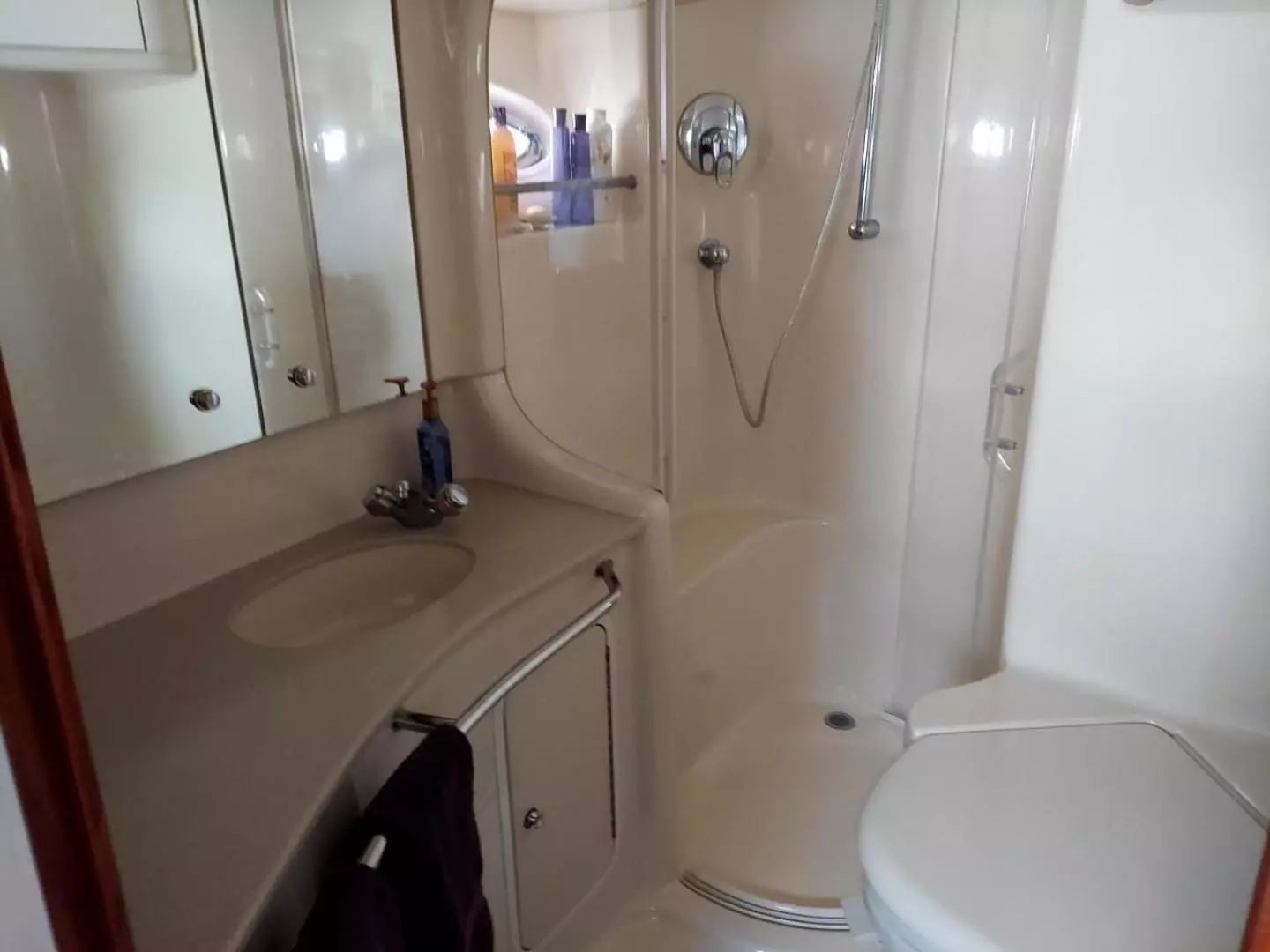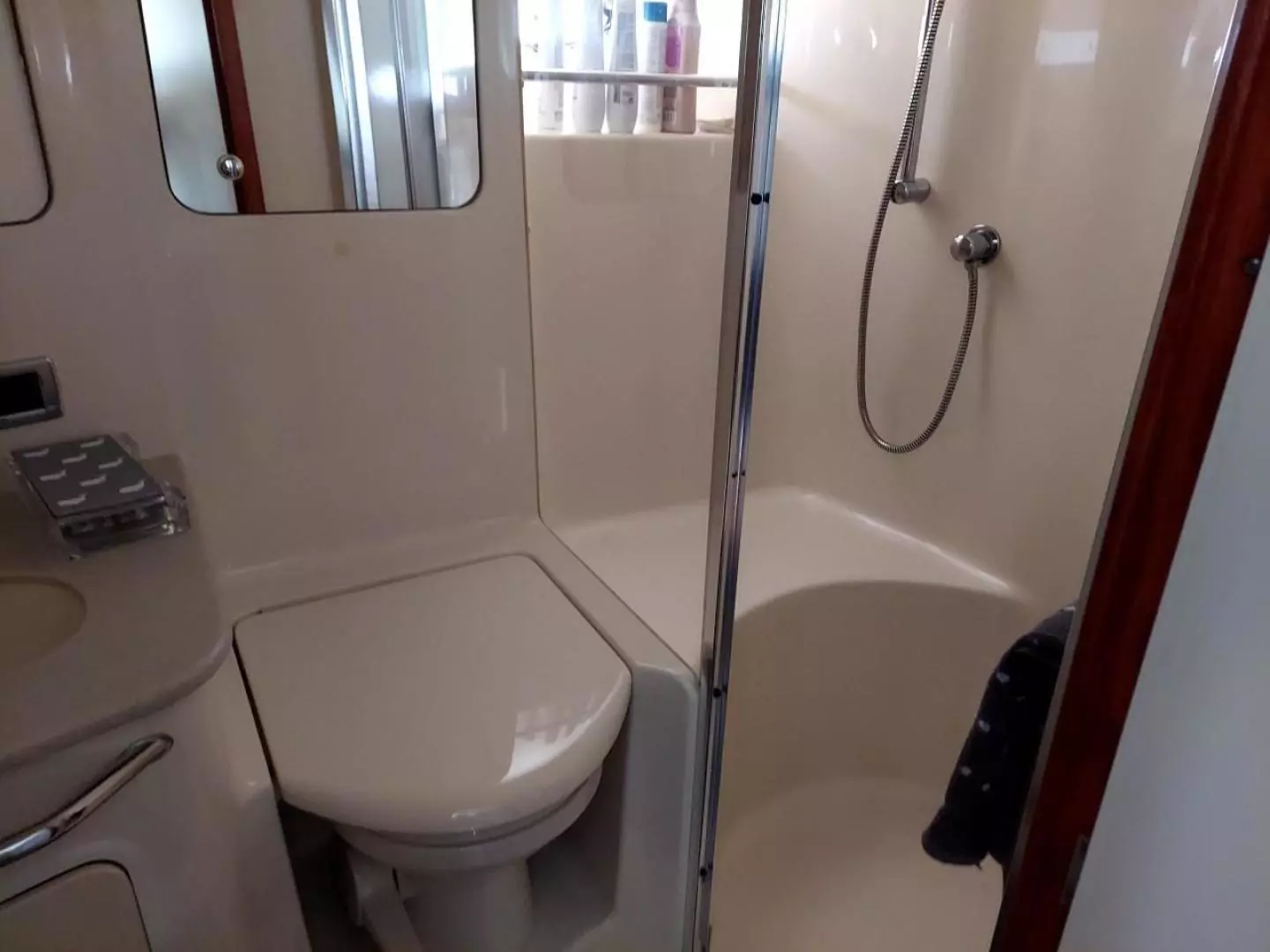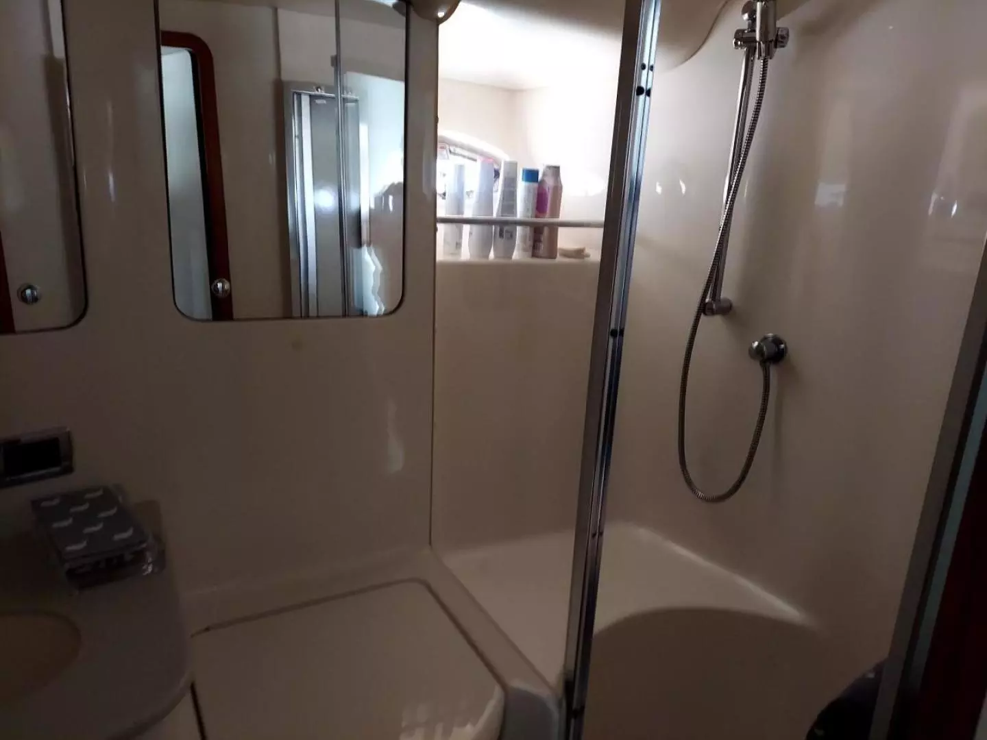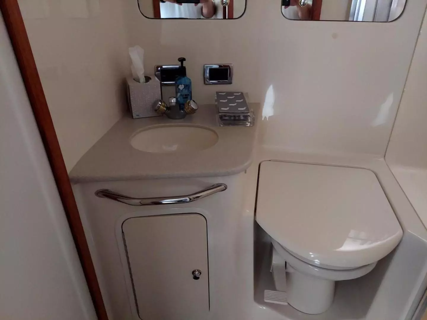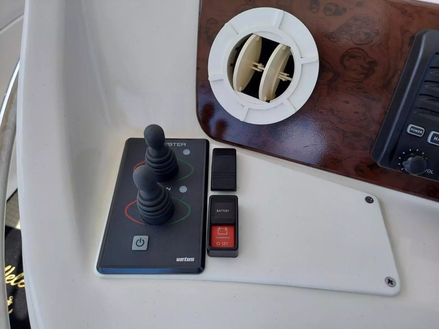The master stateroom is forward with a ventilation hatch, hanging lockers port and starboard and storage underneath. Aft to starboard is the master head with vanity, mirror and a separate stall shower. Aft again to starboard is the second stateroom with crossover berths for sleeping or a seating area. Aft to port is the day head with vanity, mirror and a separate seal shower. Aft again to port is the VIP stateroom with a queen bed, hanging locker and TV. Up a couple of steps to the salon area you have a full dinette area followed by an L-shaped sofa with storage underneath that electronically converts to a bed. To starboard you have a spacious galley area followed by a barrel chair and a Hi-Lo table. Amtico flooring in the galley area and main salon.Out to the cockpit area with a couple of deck chairs, transom bench seat and a transom door to the swim platform. Up a stairwell to the flybridge you have a center helm with a companion seat. Forward of the helm you have u-shaped seating with a large table and wet bar to port.
