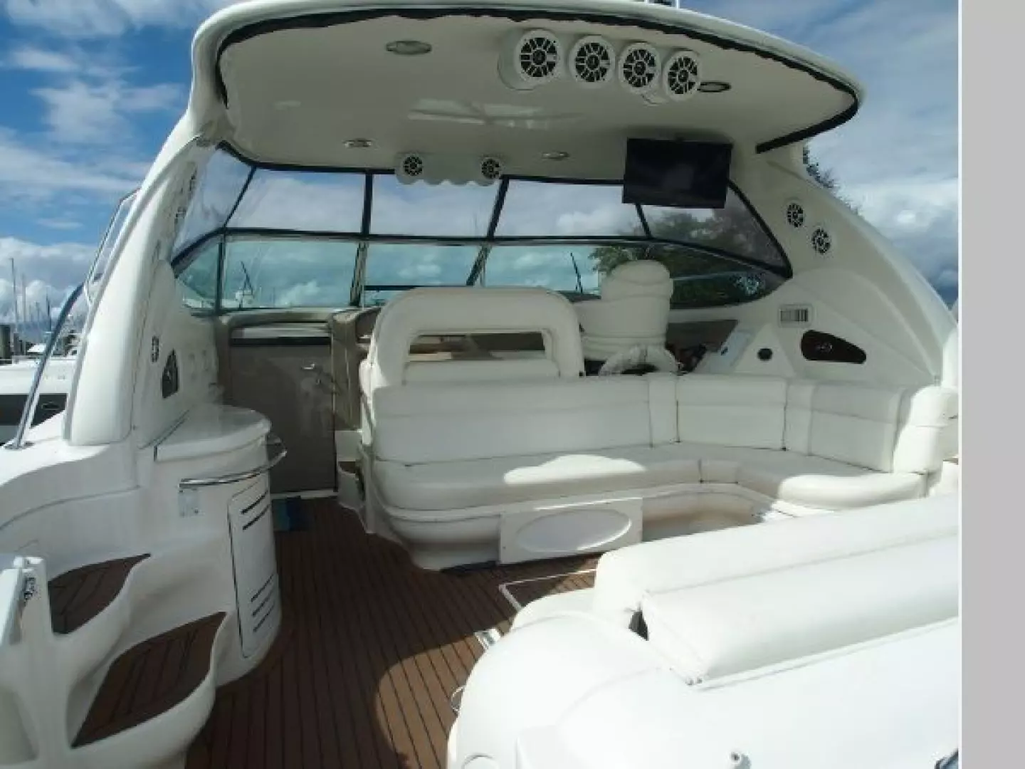 The cockpit with its wrap around helm console, retractable sun pad, stylish hardtop with seating for all your family and friends.