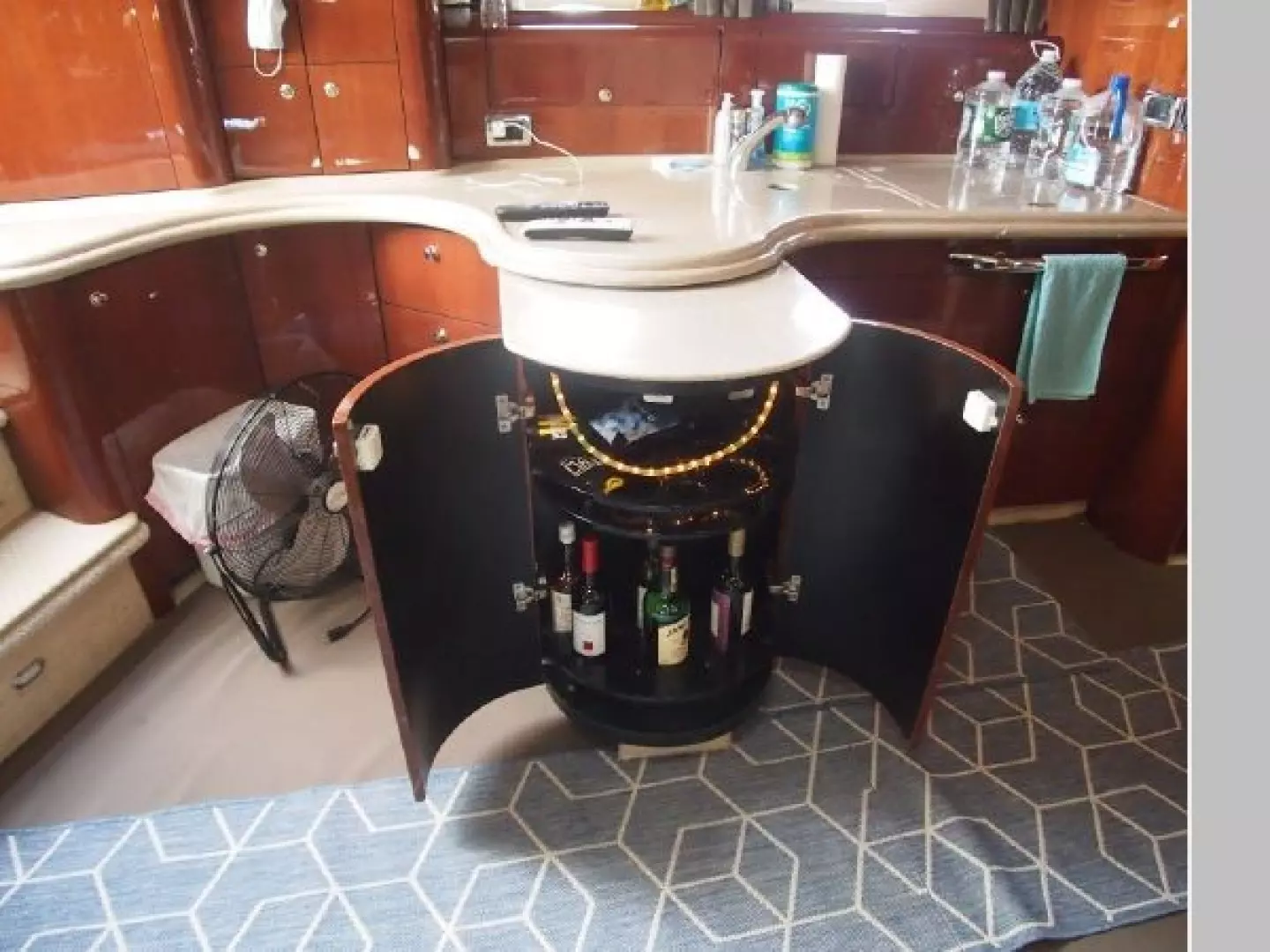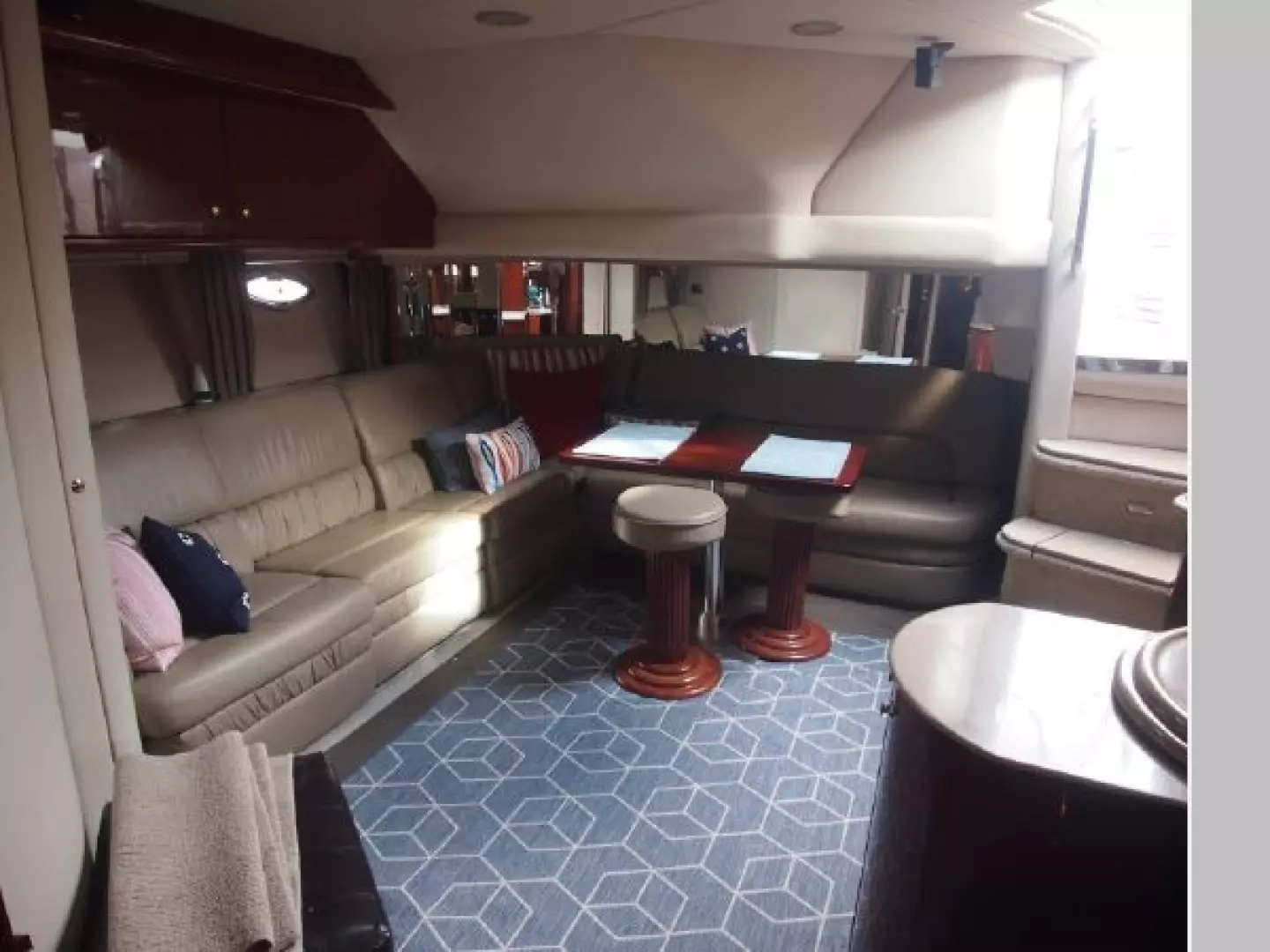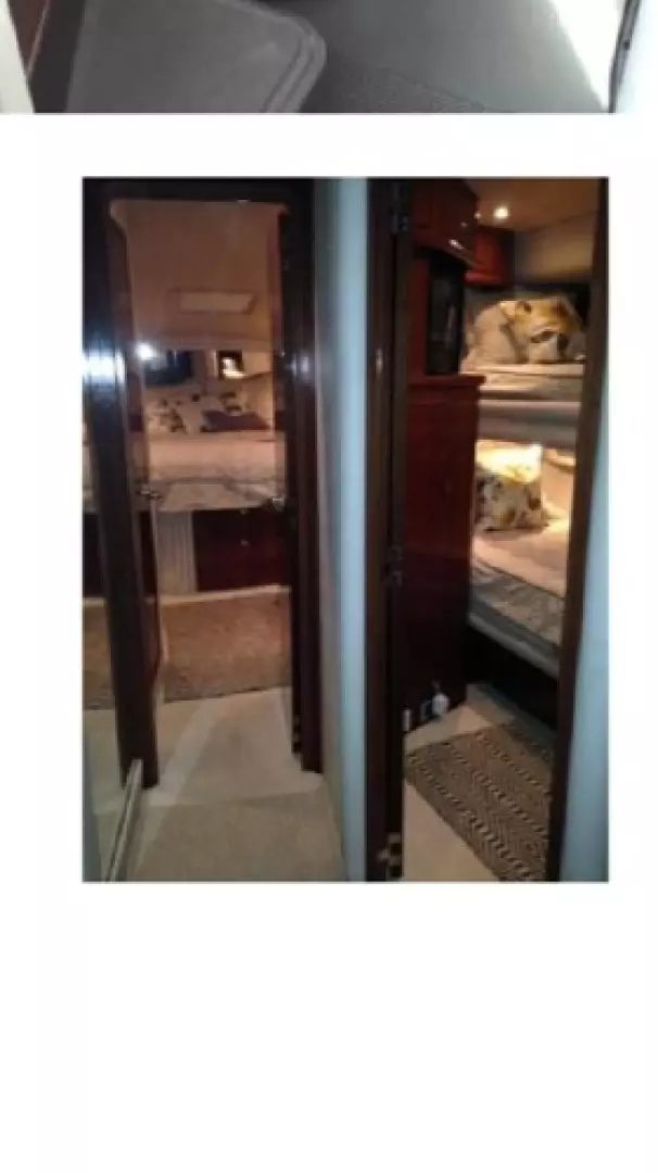 The two stateroom layout is dominated by a vast main salon with high gloss cherry cabinetry, deep pile carpeting and seating finished in Ultraleather. The galley to port with Corian counters a mini bar and plenty of storage. The master suite features an island double berth, head with separate shower.