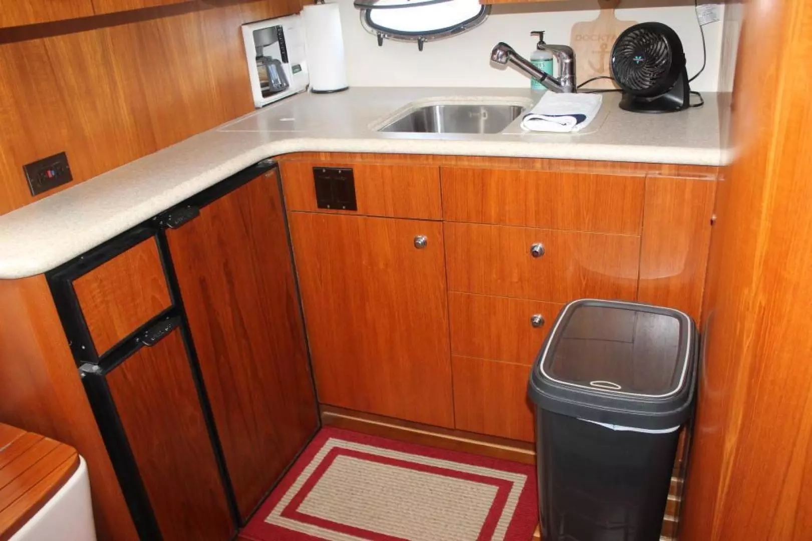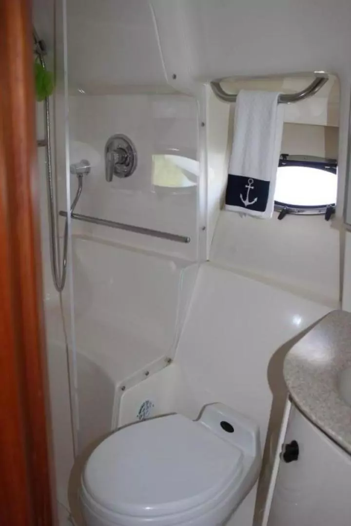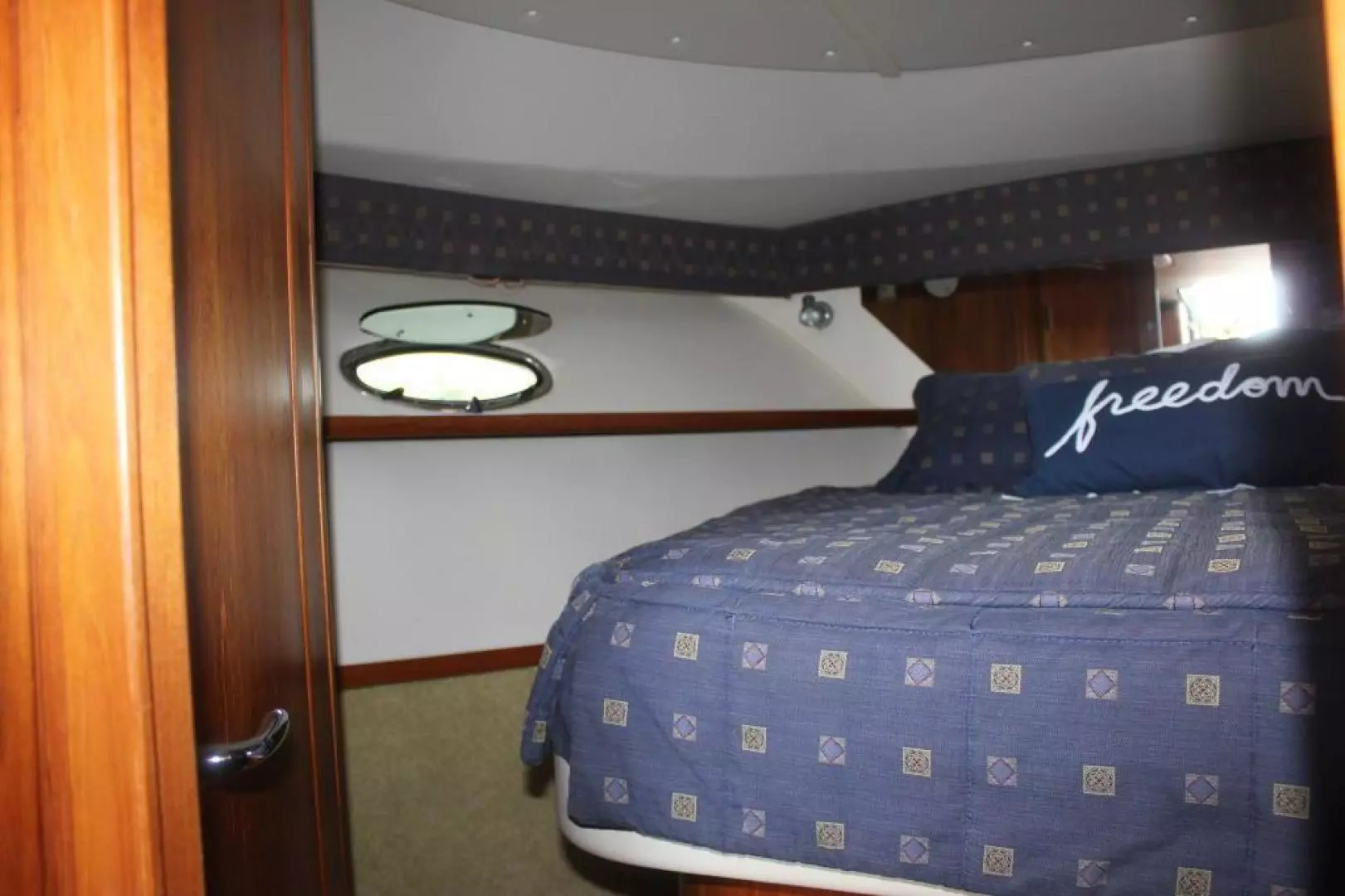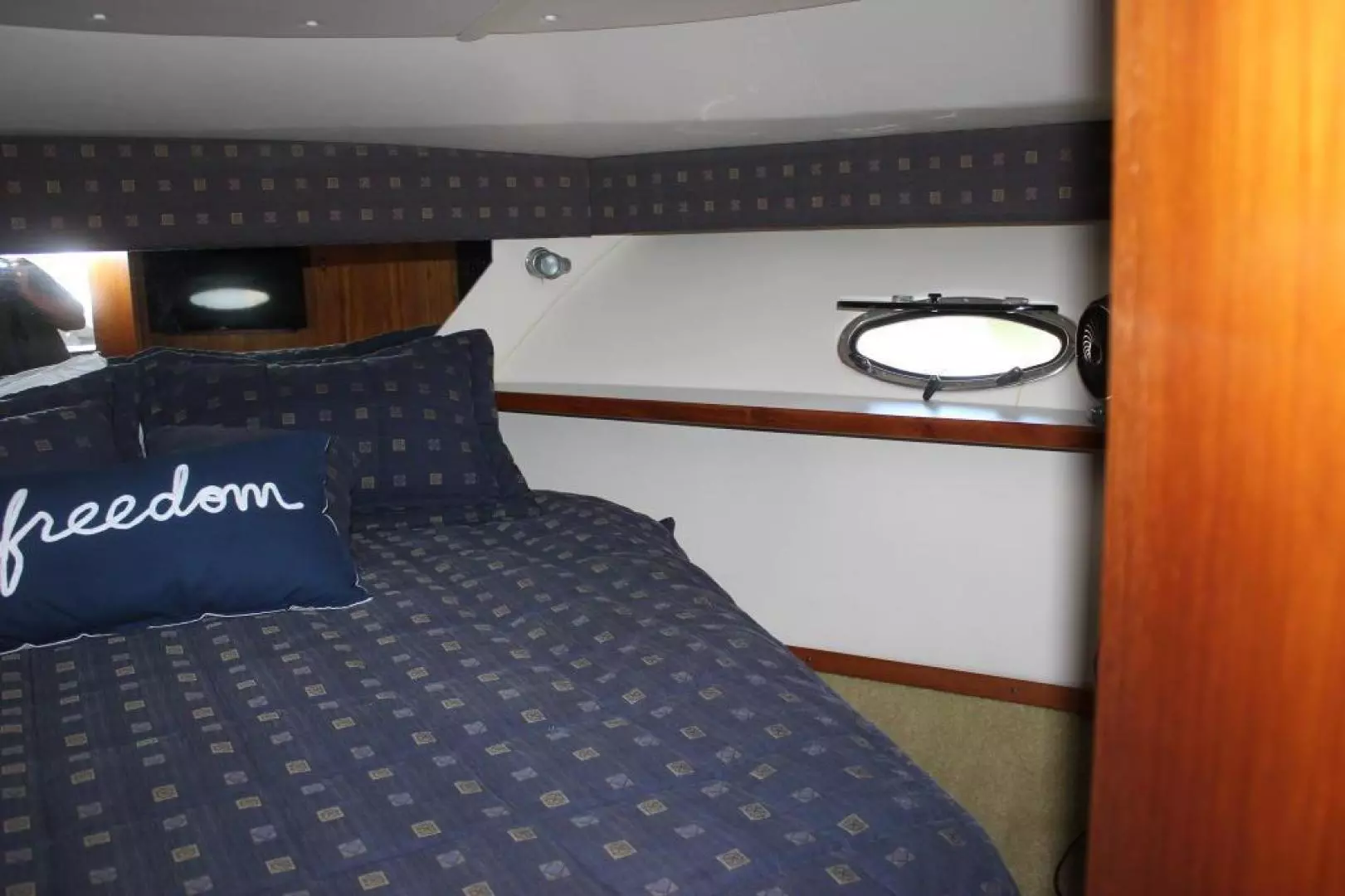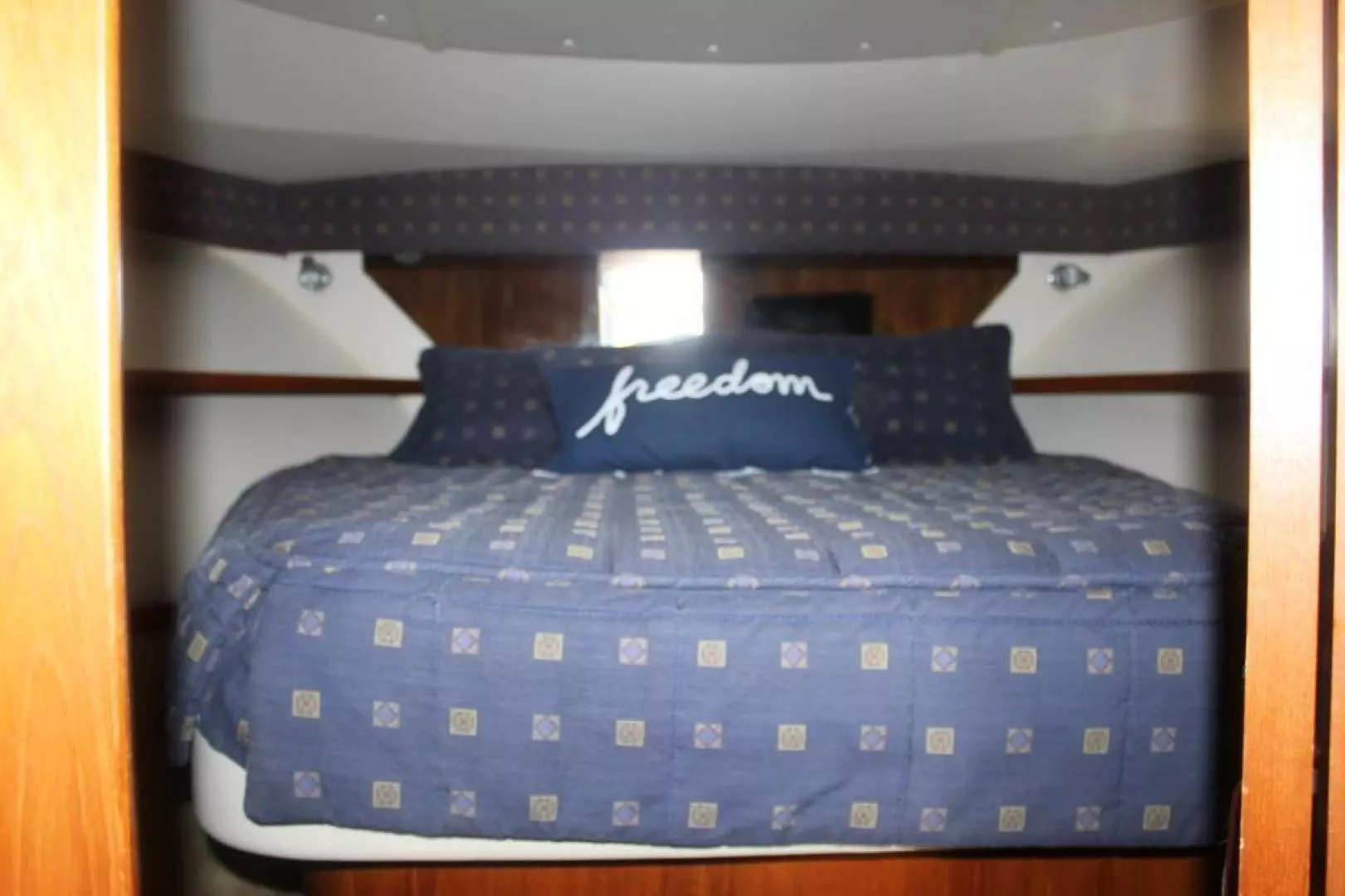 The cabin of Freedom is spacious and comfortable, featuring a double pedestal berth forward with plenty of storage below, hanging lockers, and hullside shelves. The head can be accessed from either the owner's stateroom or the salon. It has Corian countertops with sink, mirrored vanity, storage locker, and is a full fiberglass head with a separate shower stall including sliding door and sump pump. The U-shaped dinette with table and storage compartments below converts to a double berth and there is a pullman single berth above. The galley is well thought-out and features Corian countertops, S.S. double sink with pressure water system, recessed two-burner electric cooktop, built-in coffee maker, microwave oven, and refrigerator/freezer. There is a lot of storage.