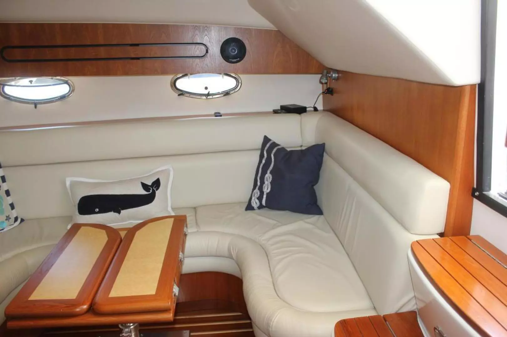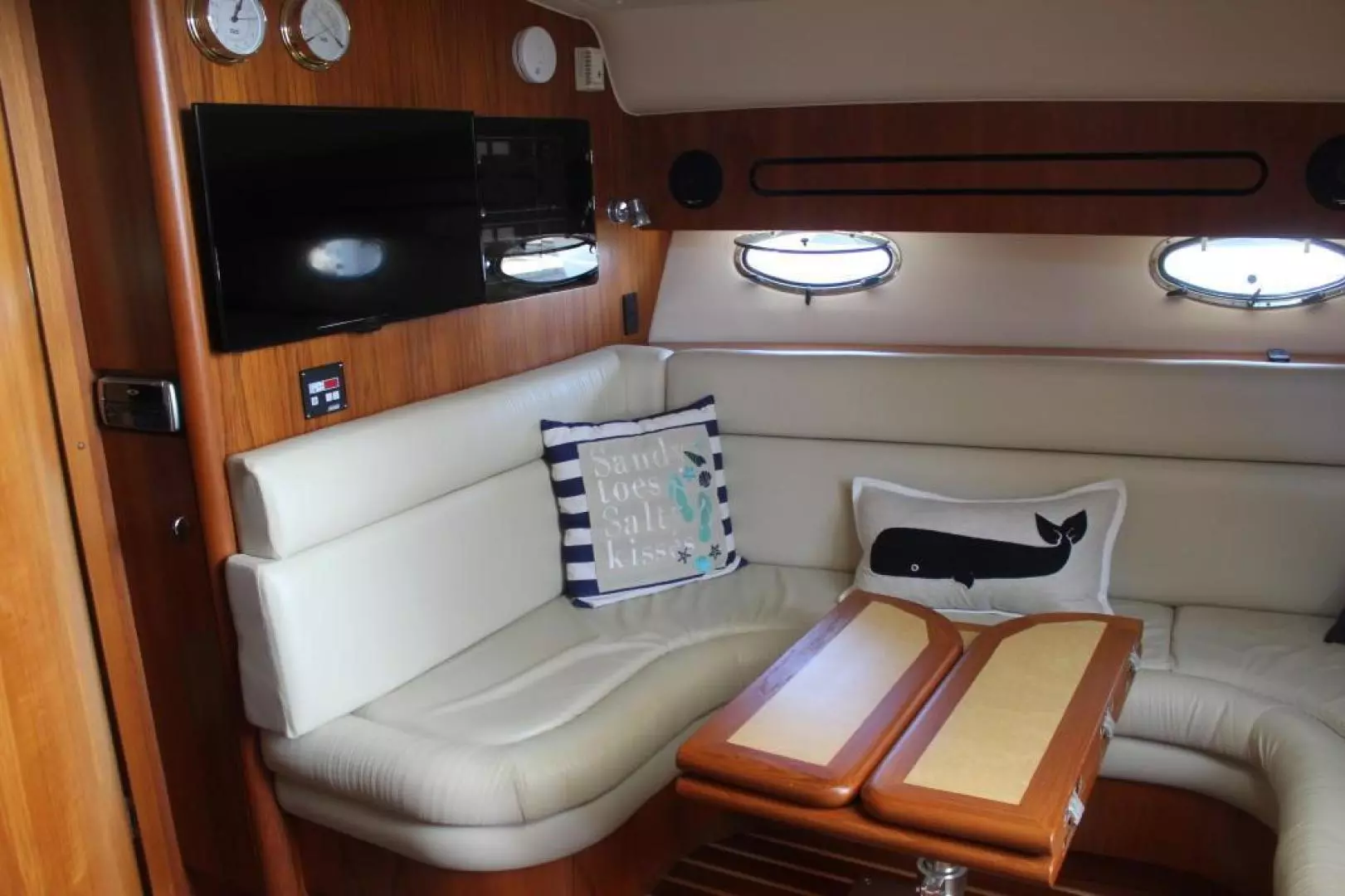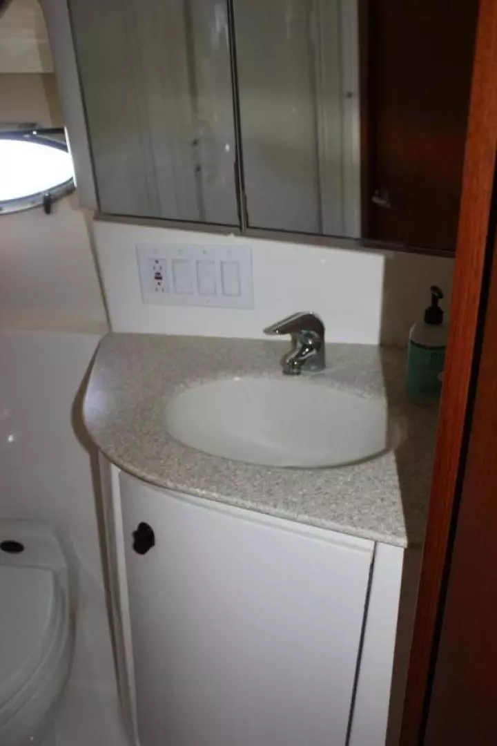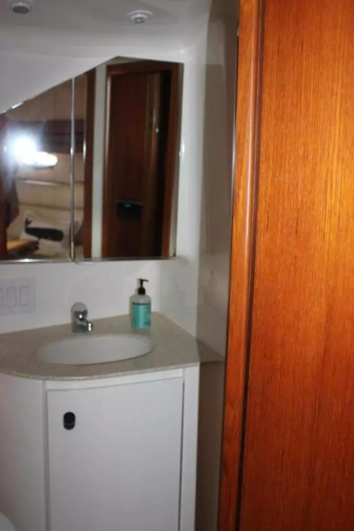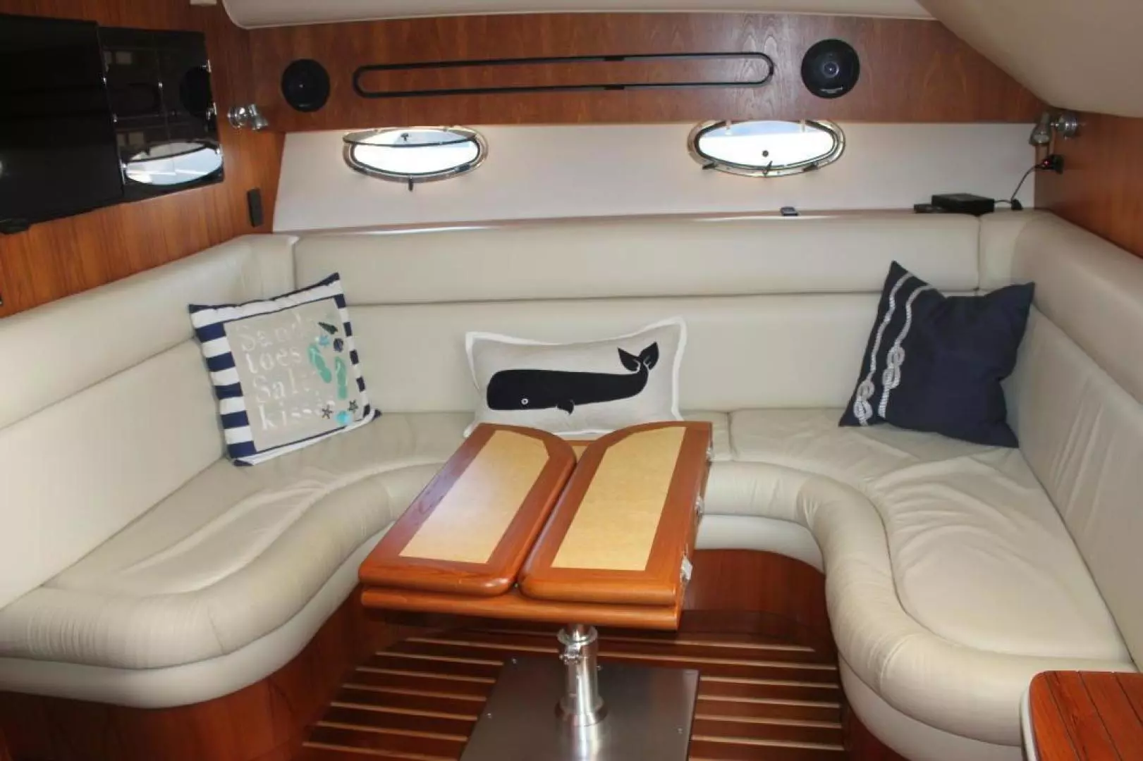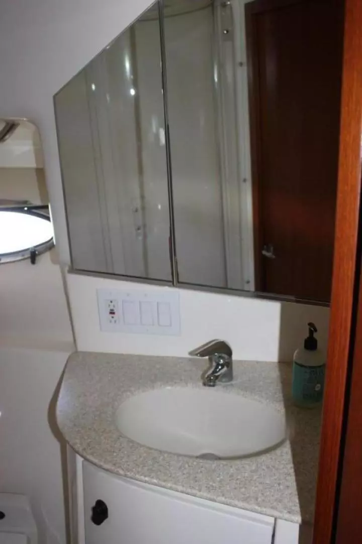 The cabin of Freedom is spacious and comfortable, featuring a double pedestal berth forward with plenty of storage below, hanging lockers, and hullside shelves. The head can be accessed from either the owner's stateroom or the salon. It has Corian countertops with sink, mirrored vanity, storage locker, and is a full fiberglass head with a separate shower stall including sliding door and sump pump. The U-shaped dinette with table and storage compartments below converts to a double berth and there is a pullman single berth above. The galley is well thought-out and features Corian countertops, S.S. double sink with pressure water system, recessed two-burner electric cooktop, built-in coffee maker, microwave oven, and refrigerator/freezer. There is a lot of storage.