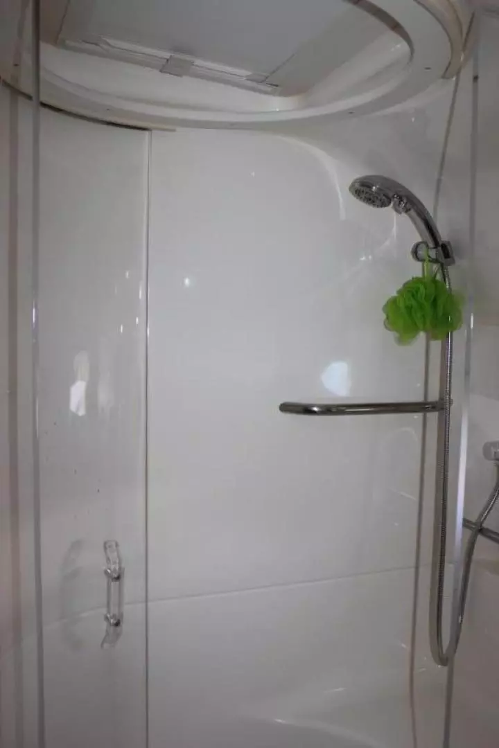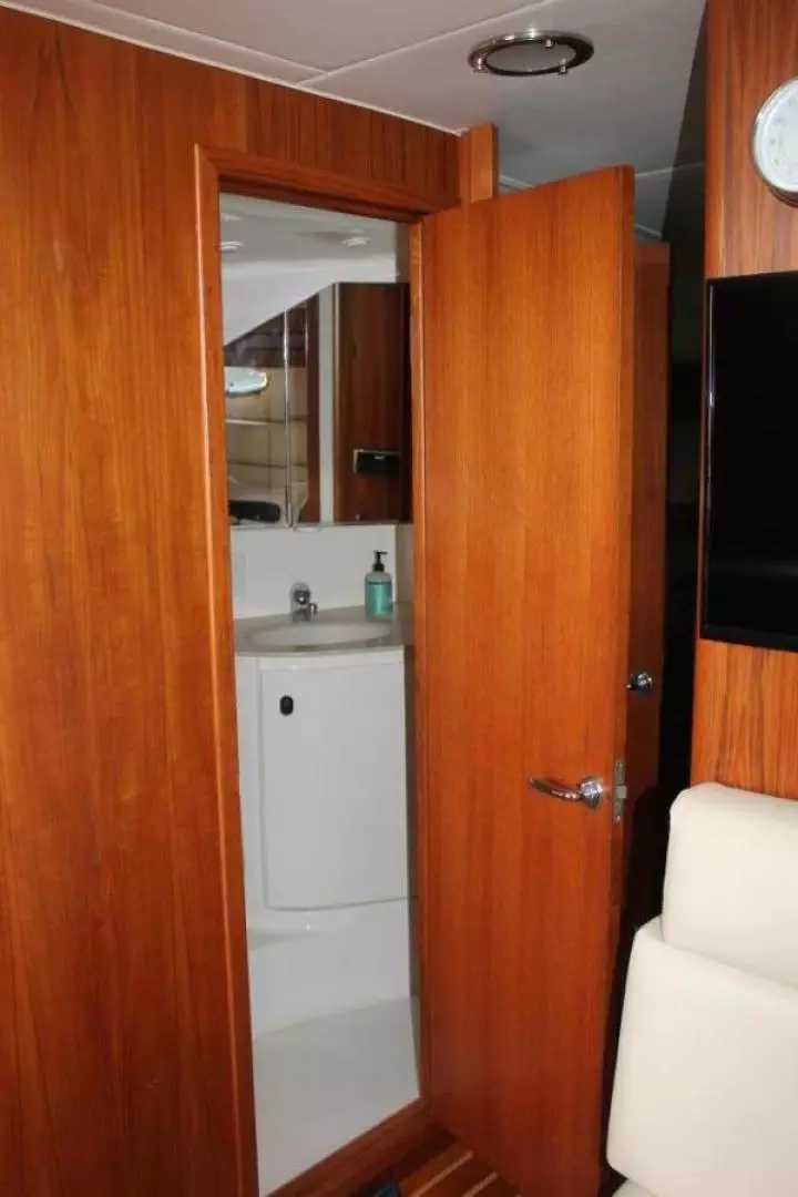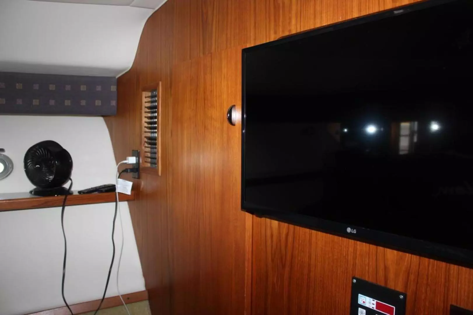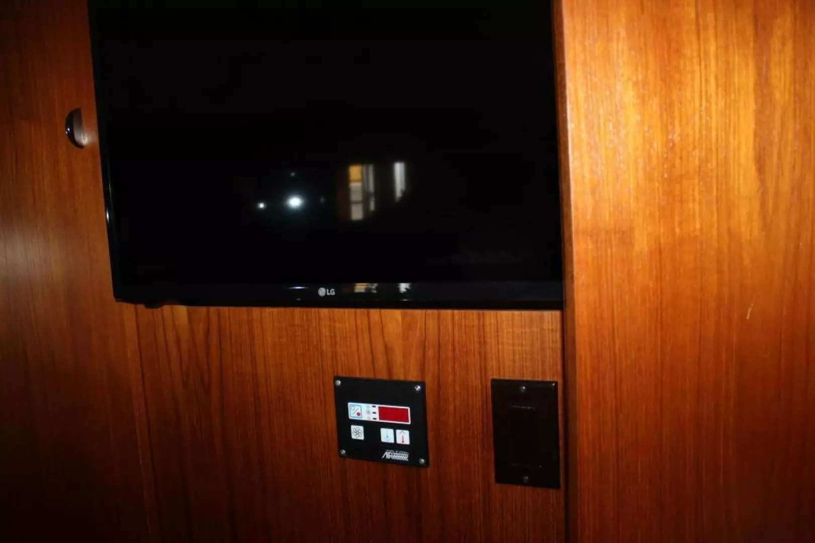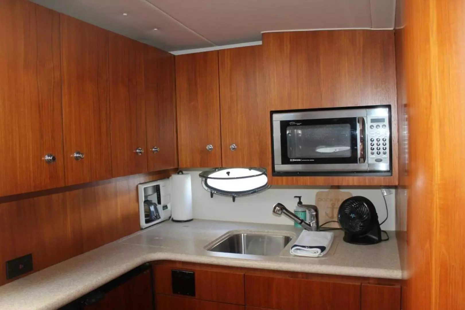 The cabin of Freedom is spacious and comfortable, featuring a double pedestal berth forward with plenty of storage below, hanging lockers, and hullside shelves. The head can be accessed from either the owner's stateroom or the salon. It has Corian countertops with sink, mirrored vanity, storage locker, and is a full fiberglass head with a separate shower stall including sliding door and sump pump. The U-shaped dinette with table and storage compartments below converts to a double berth and there is a pullman single berth above. The galley is well thought-out and features Corian countertops, S.S. double sink with pressure water system, recessed two-burner electric cooktop, built-in coffee maker, microwave oven, and refrigerator/freezer. There is a lot of storage.