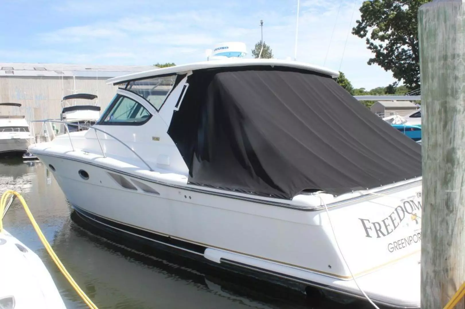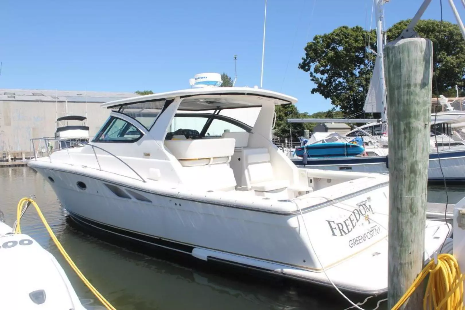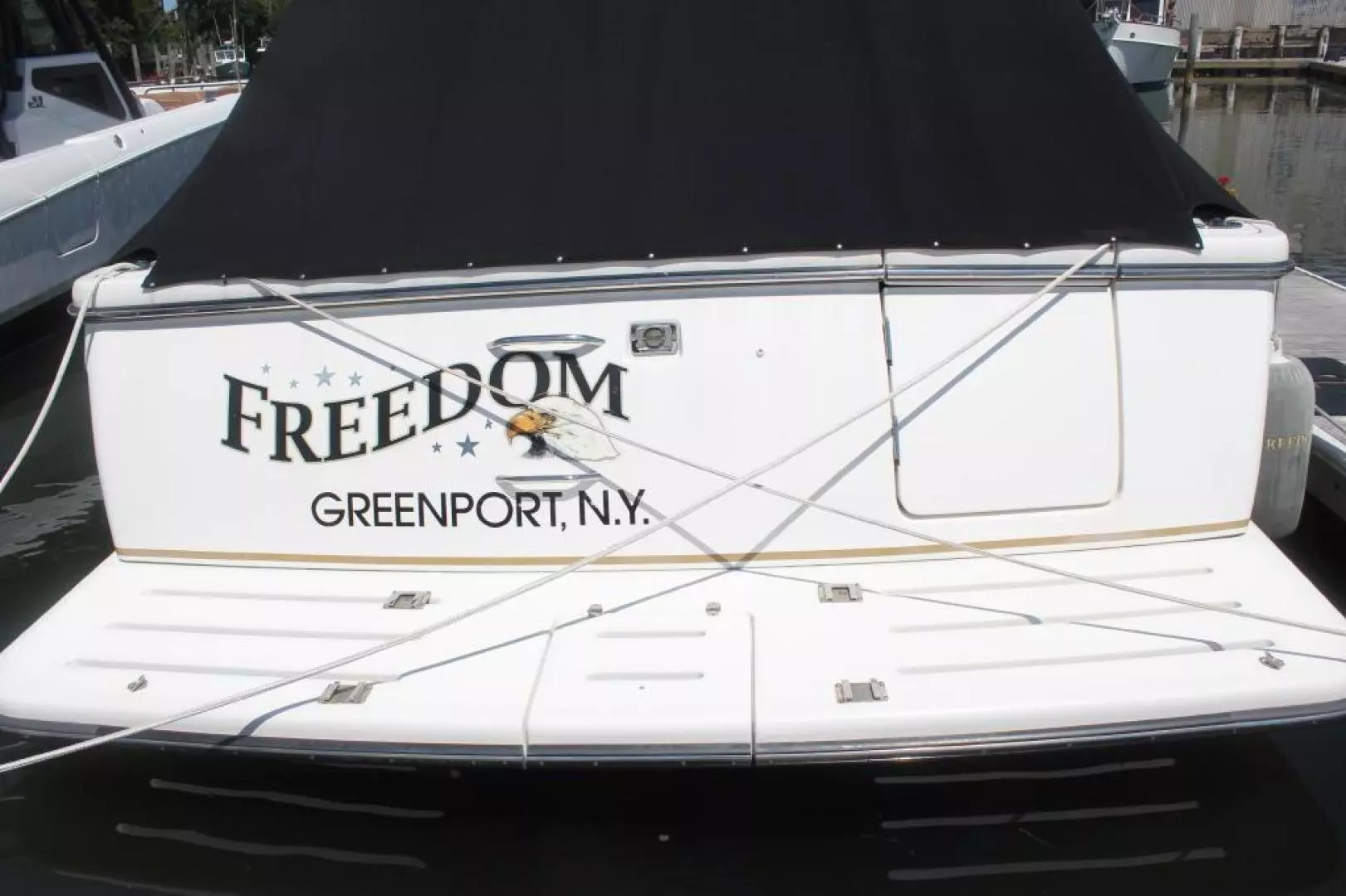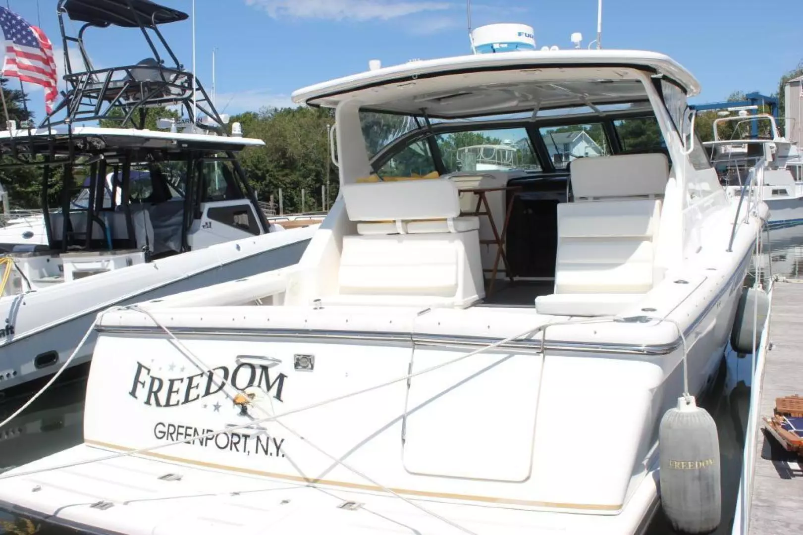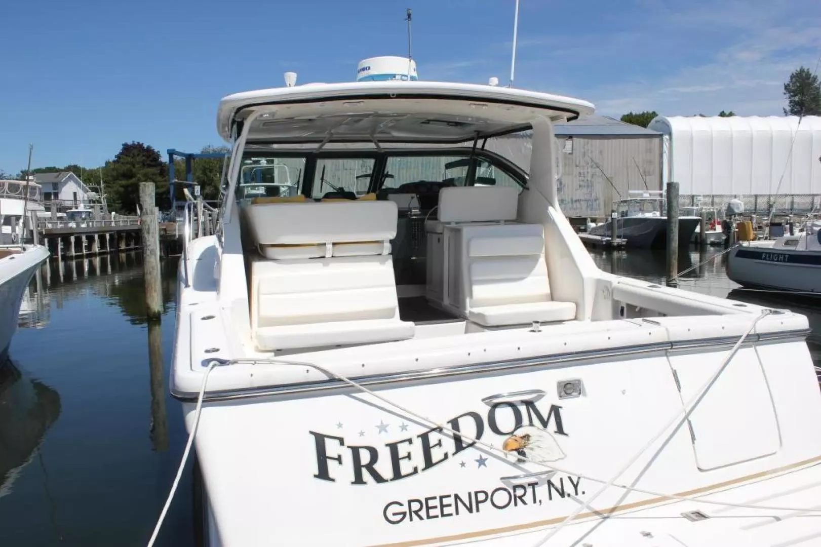 We have Freedom priced aggressively for a Fall 2022 sale. Call quickly to take advantage of this out the door price. Her slip at Safe Harbor Stirling is included for the remainder of the season along with the option to have the slip next year. Her air-conditioned salon has a huge U-shaped settee to starboard, opposite the galley and an island berth single-stateroom interior. There is a separate stall shower in the head, and the beautiful teak-and-holly cabin sole gives the interior a traditional feel found in few other boats. The cockpit has port and starboard aft-facing seats and a fold down stern seat. The entire helm deck lifts mechanically for easy access to the large engine room. Additional features include a TV in the salon, a cockpit wet bar, transom door and shower and wide side decks. Prop pockets reduce the shaft angles and draft. Her T-435 HP Cats 3208s have 1056 hours. This boat is in excellent condition with recent bottom paint and detailing. Check out the Full Specs and call for an appointment to see her. You won’t be disappointed. She is located in Greenport NY.