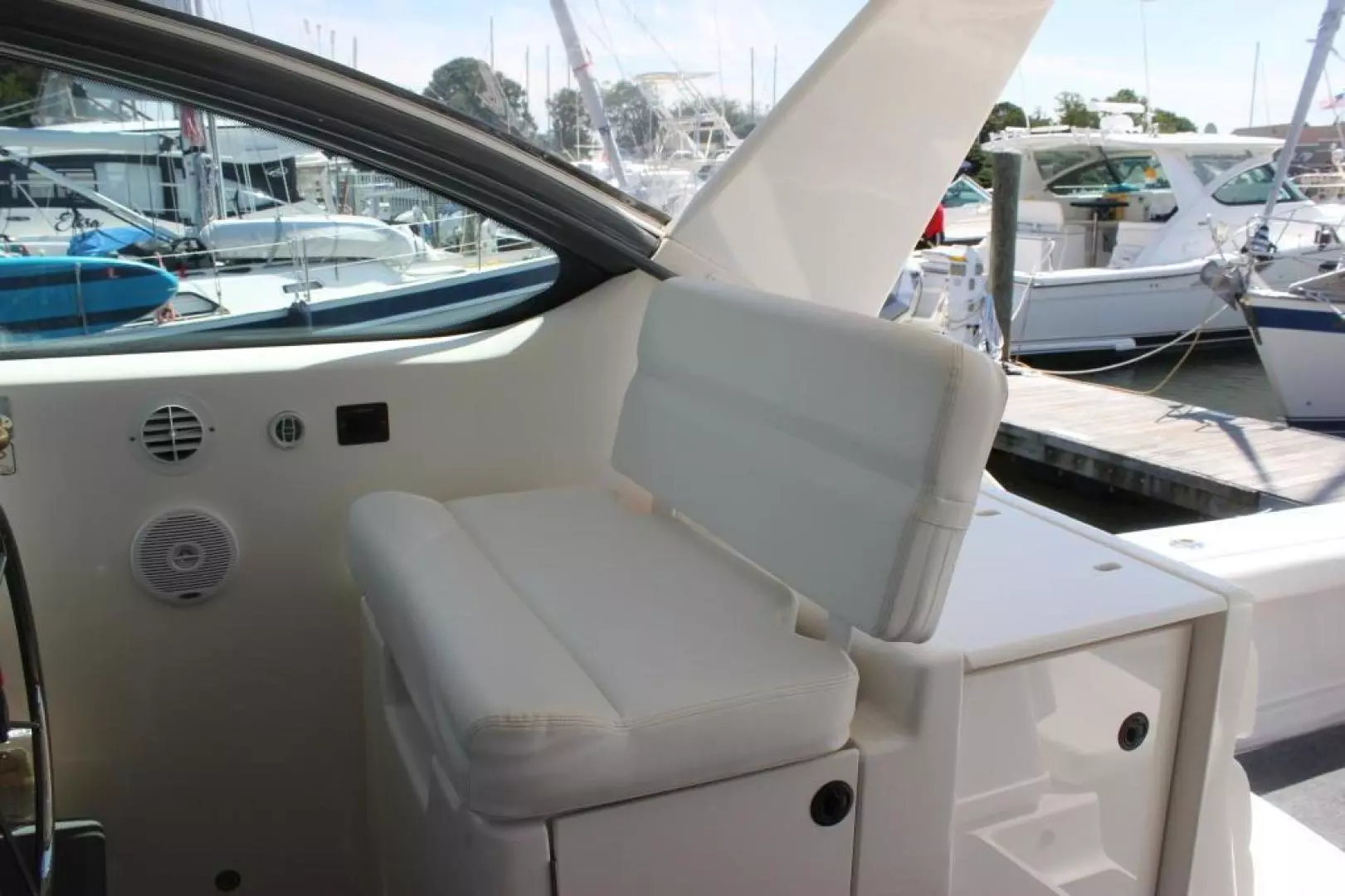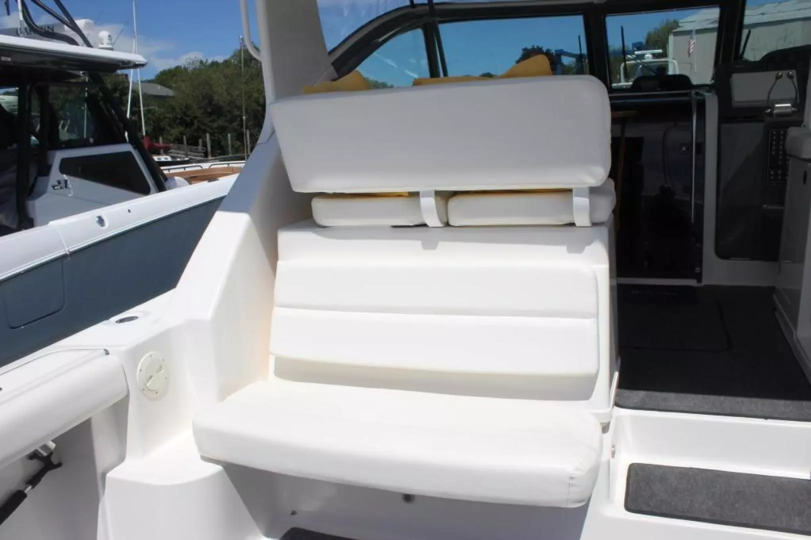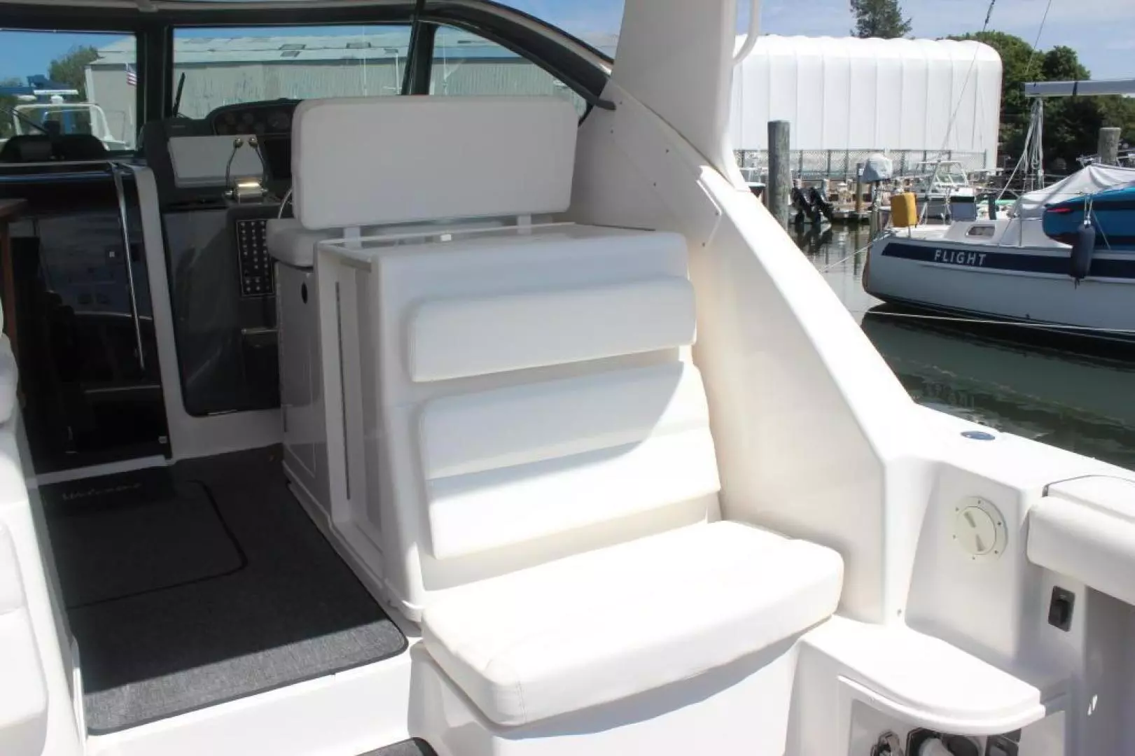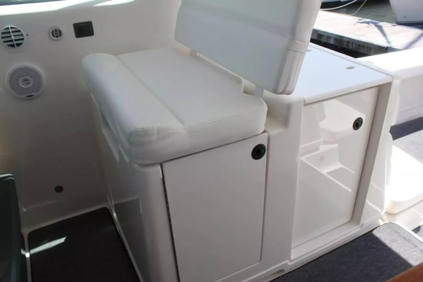 The helm is a heads up fiberglass tilt-away helm station with full flush mount electronics. There is an oversized helm seat forward with wet bar and aft-facing seat. To the port is a spacious curved lounge with storage. Aft of the curved lounge is a standard aft-facing seat.