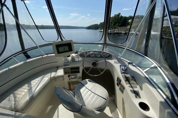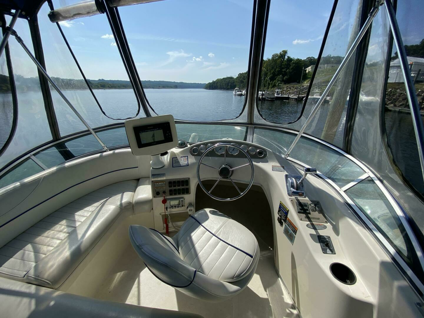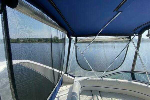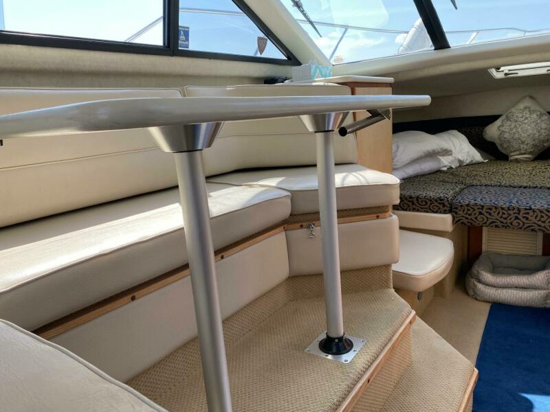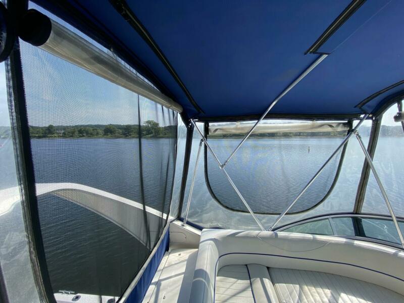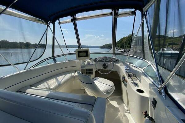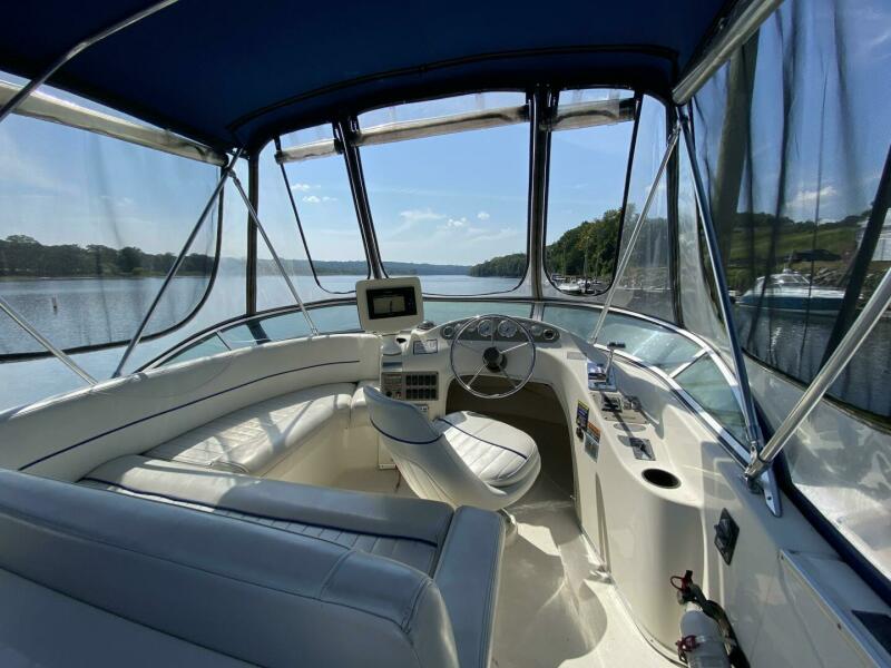 The flybridge has stunning views and a comfortable ride with L-shaped settees and a helm seat that swivels. The canvas is in great condition and has full isinglass and insect screens for outside enjoyment after the sun goes down.