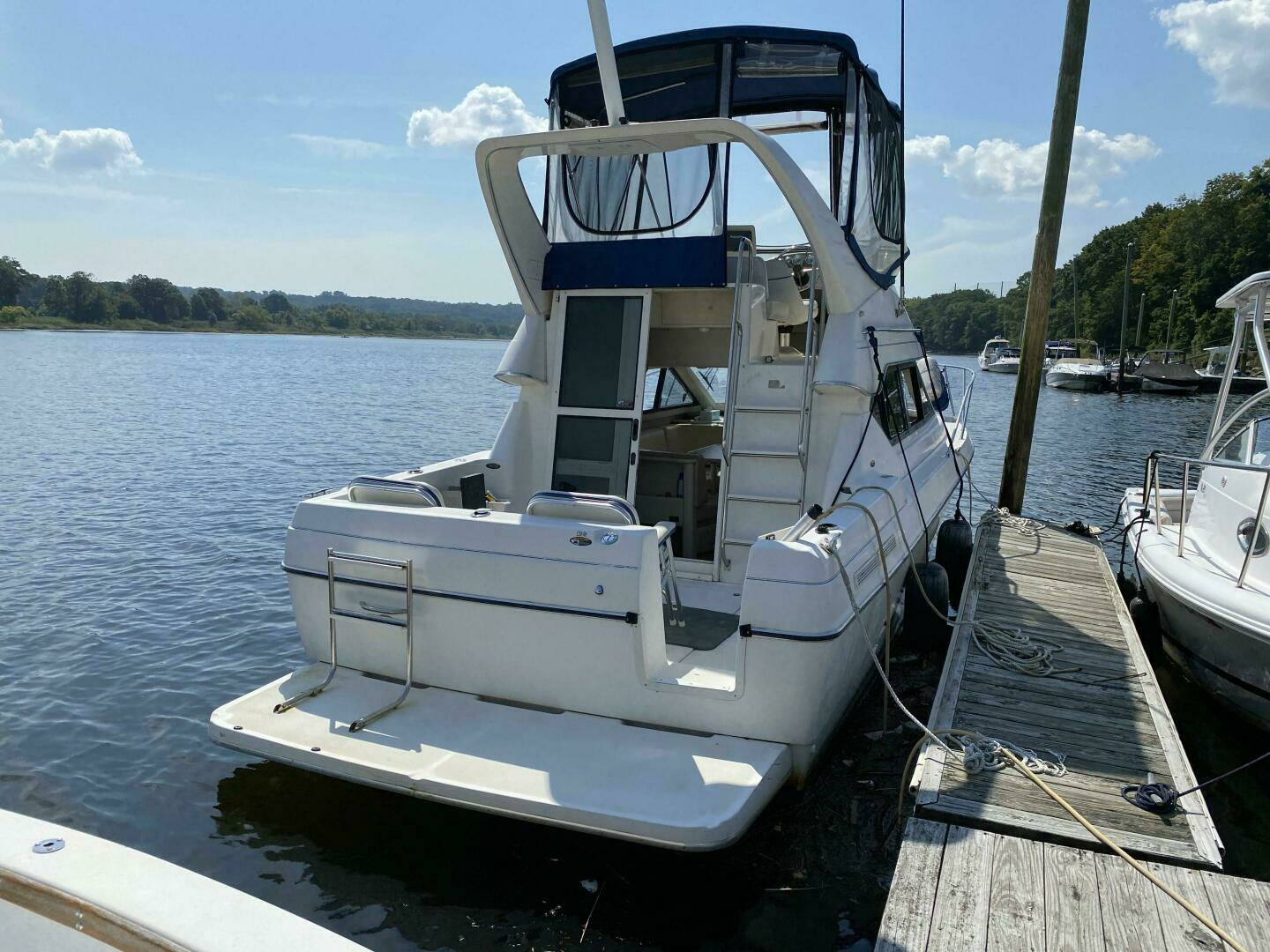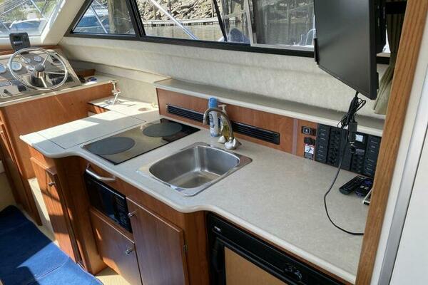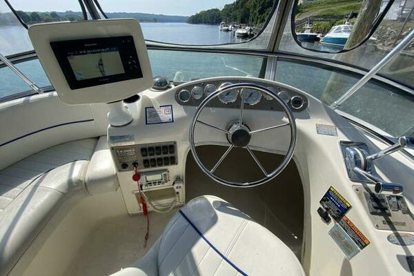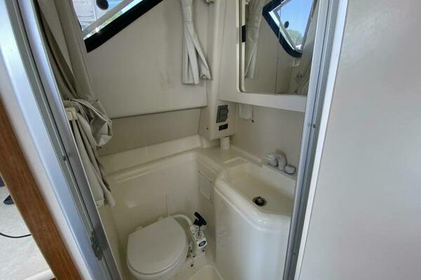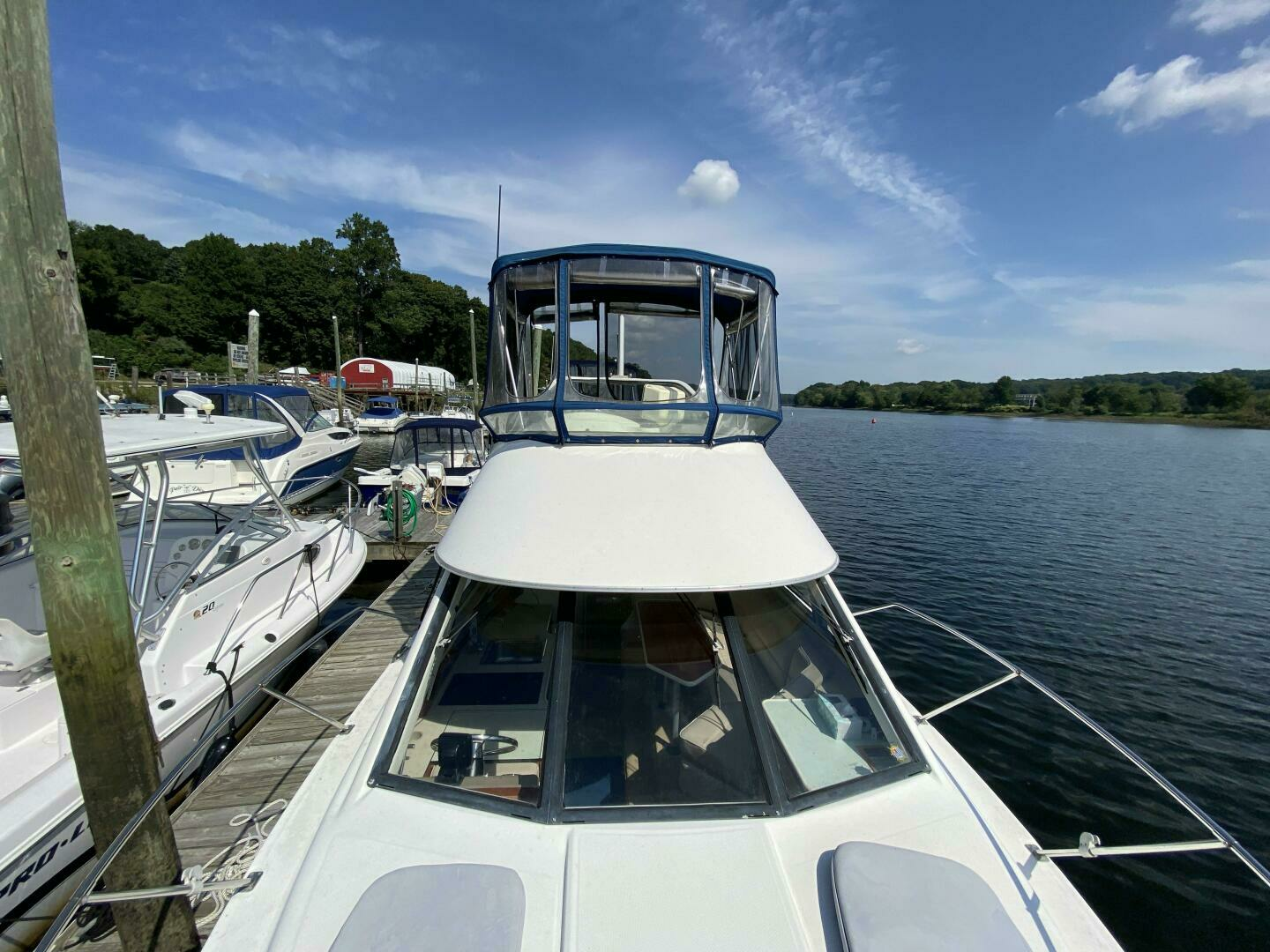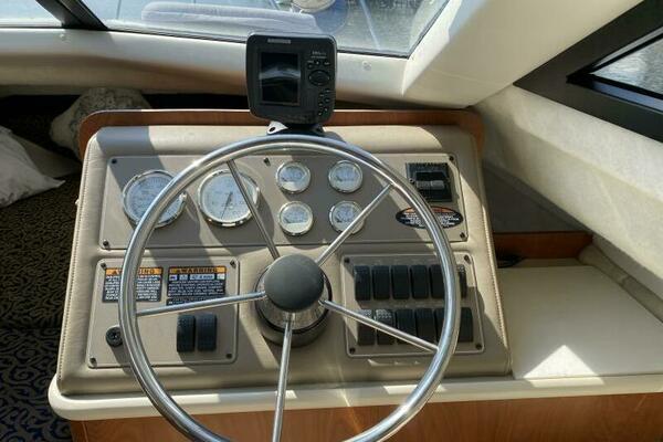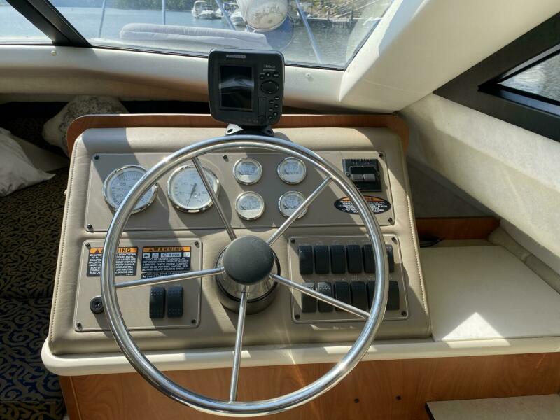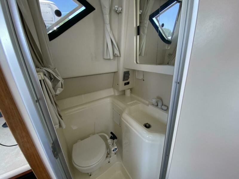 A V-berth forward, convertible dinette and private mid-cabin berth below the raised salon settee sleep six. With good natural light and ventilation, A/C, dual helm stations, galley, dinette, enclosed head with shower, spacious flybridge and cockpit, this boat surprises with all that it offers.