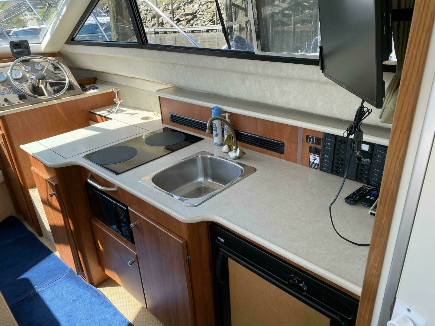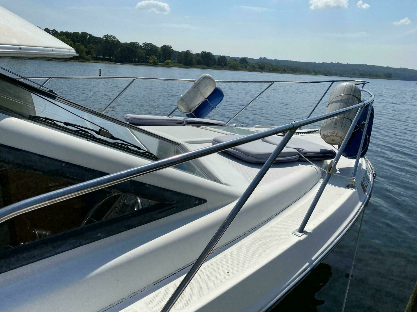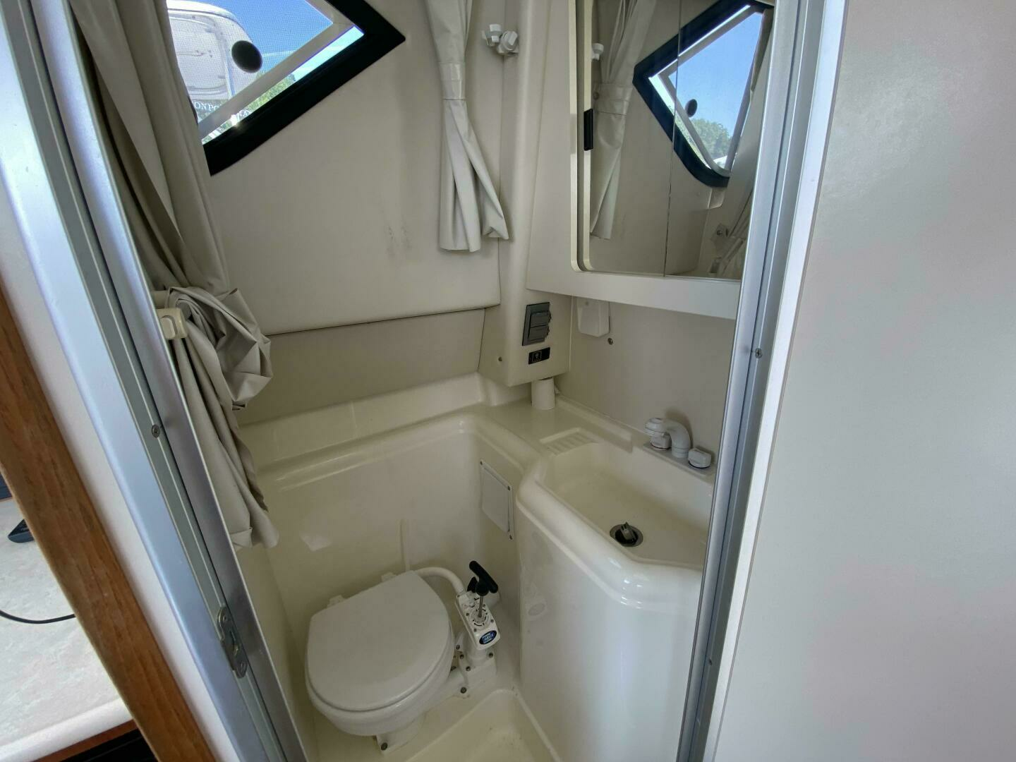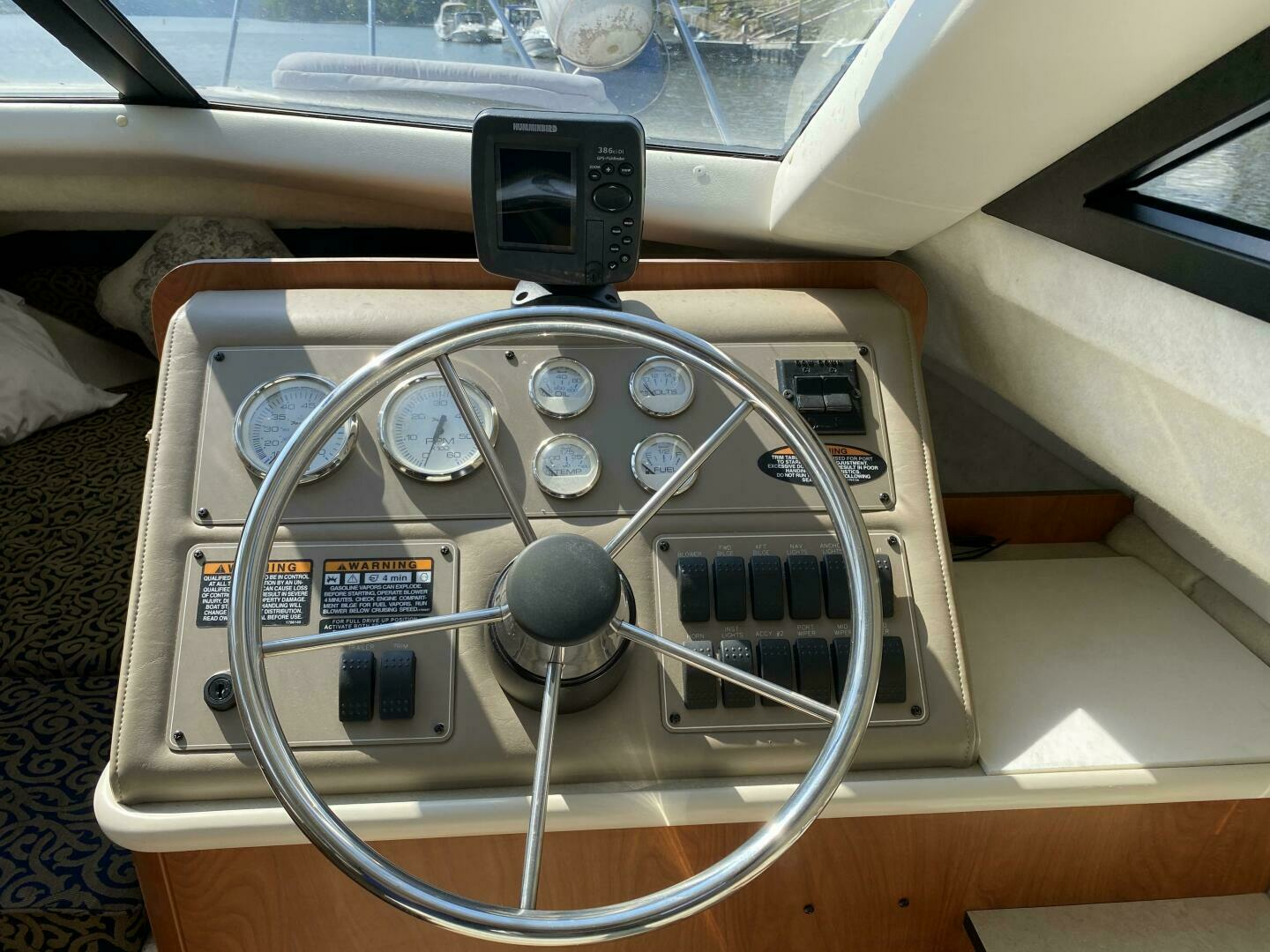 A V-berth forward, convertible dinette and private mid-cabin berth below the raised salon settee sleep six. With good natural light and ventilation, A/C, dual helm stations, galley, dinette, enclosed head with shower, spacious flybridge and cockpit, this boat surprises with all that it offers.