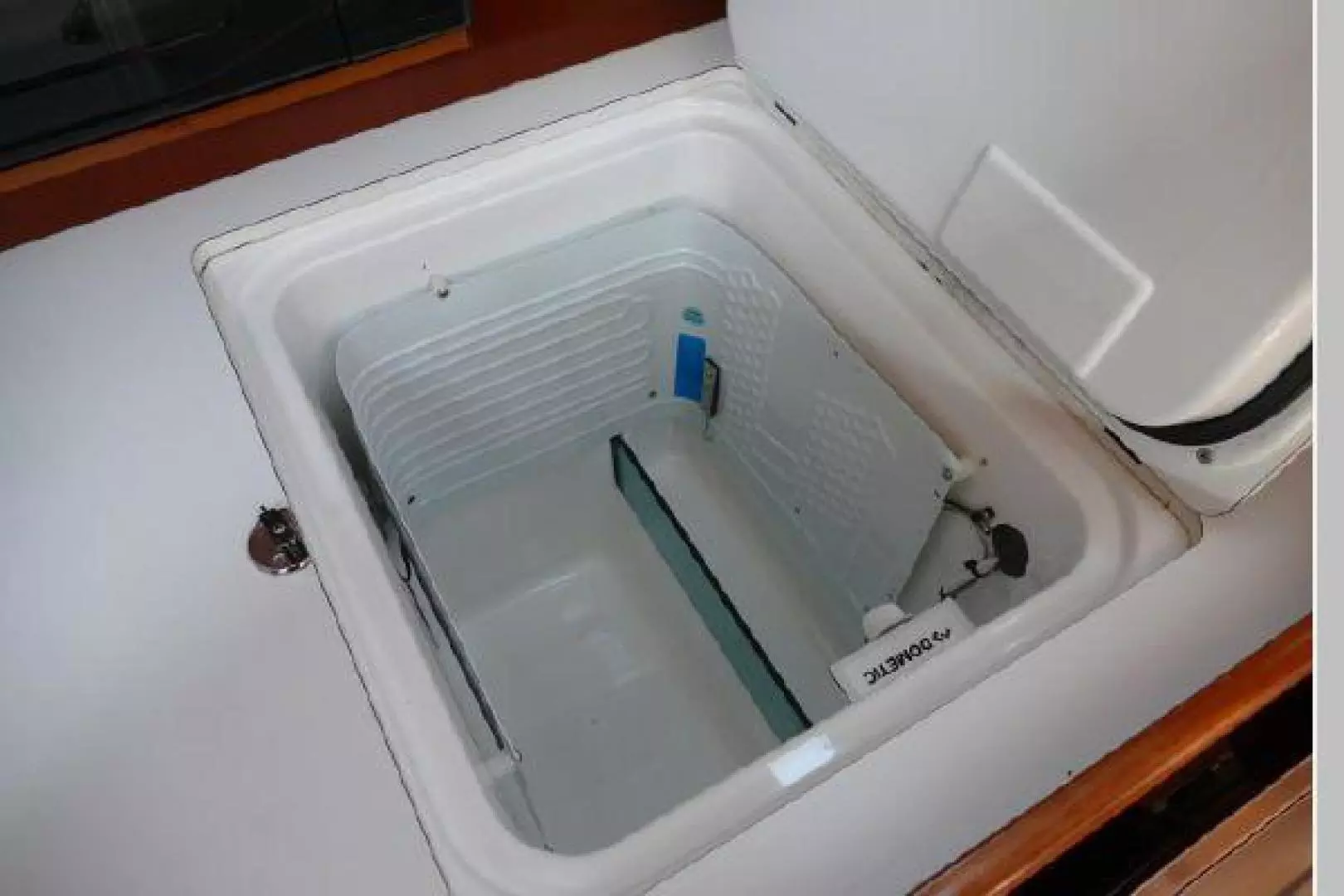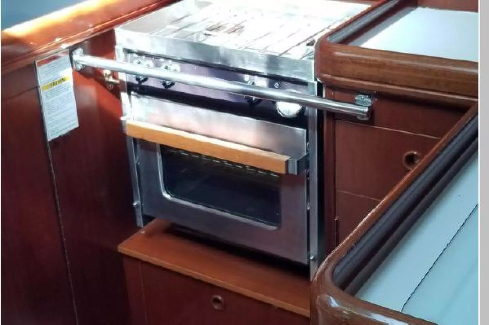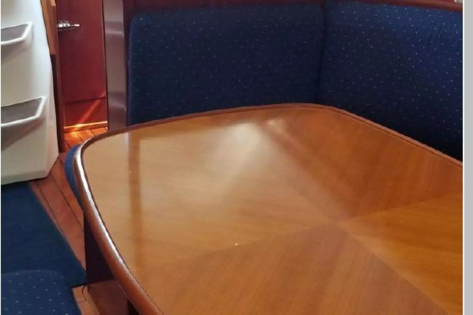 Coming down the companionway, she has a U-shaped Galley to port w/ double S/S sink, pressurized hot & cold mixer taps in galley and heads. A 2-burner/oven-propane stove, 12V Fridge/Icebox. Head off salon, 2 berth aft cabin w/hanging locker, forward cabin w/ 2 berth Pullman + hanging locker. The second head is located in the bow. A C shaped dinette w/ bench is to port with starboard side cabinets in the salon. The portside Nav Station faces forward and is opposite the dinette.
