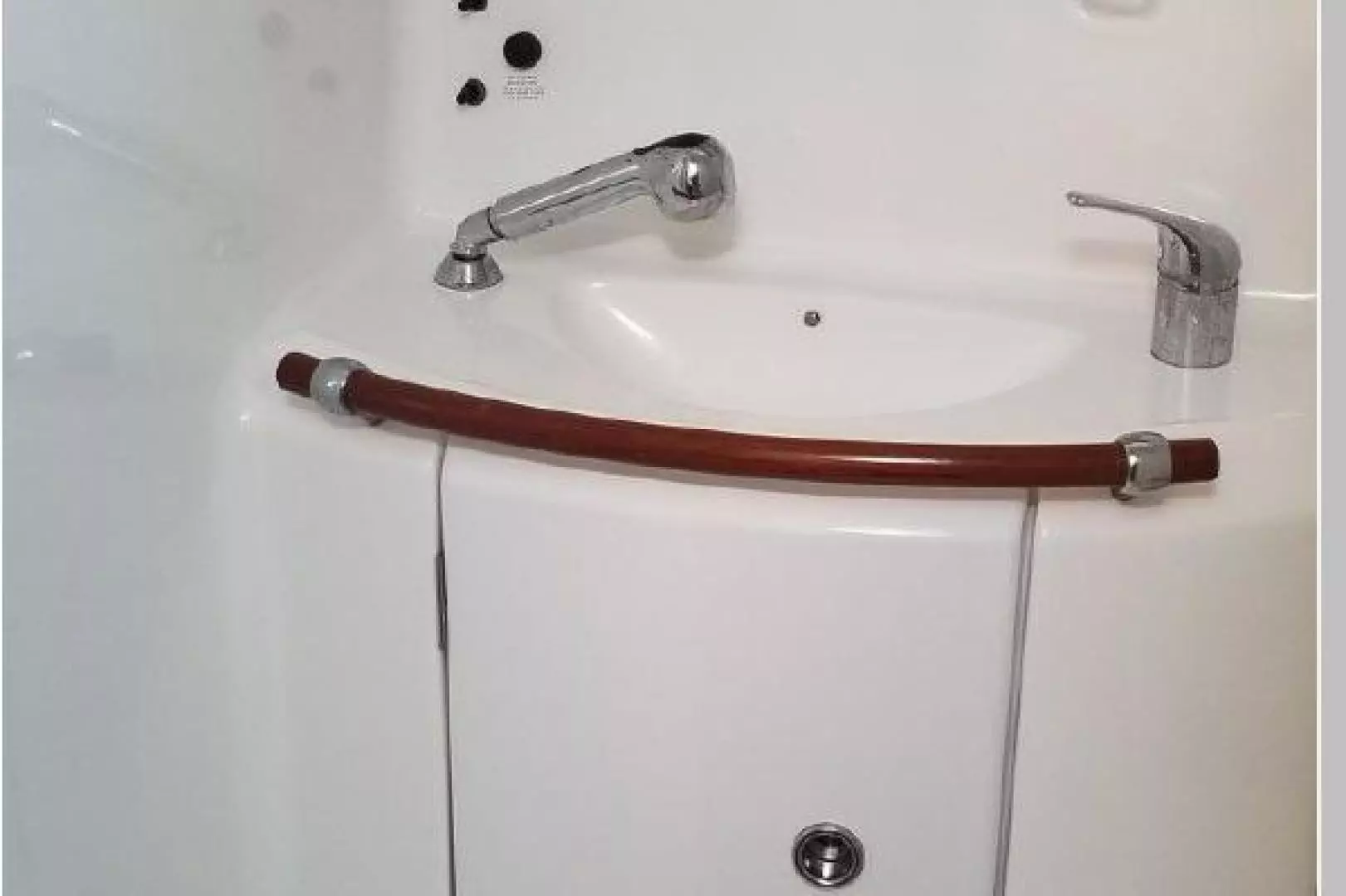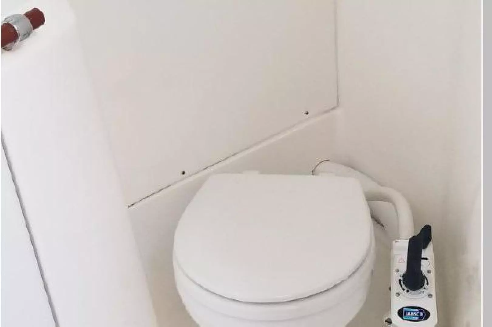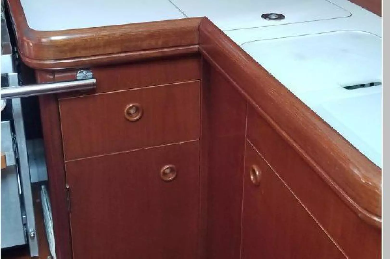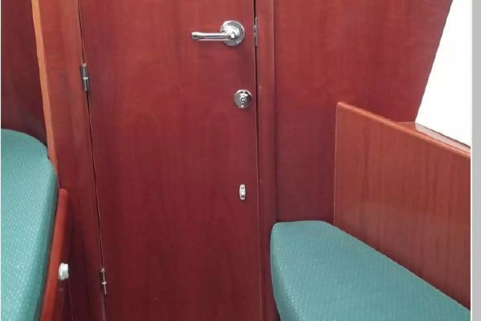 Coming down the companionway, she has a U-shaped Galley to port w/ double S/S sink, pressurized hot & cold mixer taps in galley and heads. A 2-burner/oven-propane stove, 12V Fridge/Icebox. Head off salon, 2 berth aft cabin w/hanging locker, forward cabin w/ 2 berth Pullman + hanging locker. The second head is located in the bow. A C shaped dinette w/ bench is to port with starboard side cabinets in the salon. The portside Nav Station faces forward and is opposite the dinette.