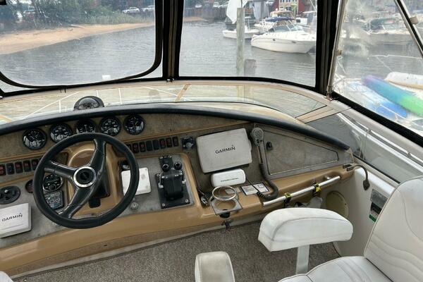 The Carver 360 Sport Sedan is great for Entertaining friends & family along with the interior space of a very pointed motor yacht? The Carver 360 has enough living space if you want to Hang out at the Dock or just Cruise along the inter-coastal, with the versatility that this Carver 360 has, it allows for the flexibility of staying overnight or longer. There is plenty of space in the Kitchen area to make a meal and plenty of storage throughout the vessel. A Bow Thruster makes this vessel much easier to navigate at the Docks. The Hull construction is solid fiberglass, and her traditional modified-V hull provides a comfortable open-water ride. Below, the spacious full-beam salon of the 360 Sport Sedan is made possible by elevating the side decks above the lower salon windows. The main cabin is arranged with a raised dinette/lounge forward with Ultraleather seating. Forward, the guest stateroom features convertible twin berths, and the bow stateroom has a queen-sized island berth and private access to the head with separate glass shower stall. The hardwood floor in the galley area complements the granite-like counters and cherrywood cabinets. Getting around the Sport Sedan is easy—in each forward corner of the cockpit a five-step stairway leads to the side decks while an additional staircase provides access to the expansive bridge. Topside, the helm is on the centerline flanked by companion seats. Volvo 375hp gas inboards cruise the Carver 360 Sport Sedan 16–18 knots