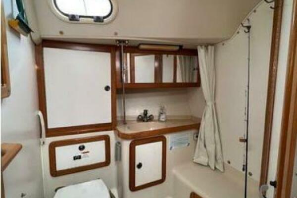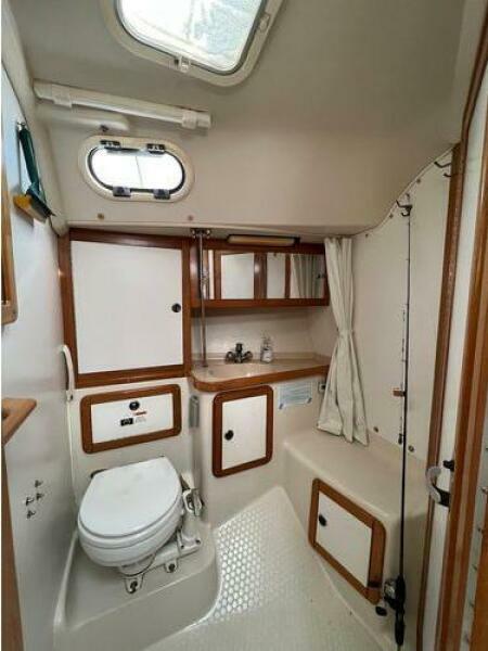 - Starting forward is the first private cabin; V-berth with filler, overhead hatch and opening ports for excellent ventilation, hanging locker to starboard and private access to the head on port. The head is large with toilet, vanity and seat for the shower area, storage outboard and under the vanity and opening port for added ventilation.