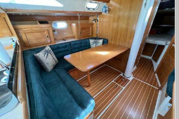- Next is the large Main salon; L-shaped dinette to port with bulkhead mounted table allowing the space to truly open up. Table can be left down and does not impede on access to the head or forward cabin. To starboard is the entertainment center and drawer storage as well as the 2 seats and game table. This can be made into a settee or berth with additional cushions. Plenty of shelves and cabinets outboard for additional storage.