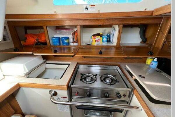 - The galley and main cabin have received special attention to design and detail. The galley is a functional 'U' shape, with corian counter tops, sinks are near centerline for proper drainage underway. A large refrigerated ice box is aft and a dry food locker is forward. A gimbaled, stainless steel propane stove with oven is standard equipment. Double stainless steel sinks with hot and cold pressure water