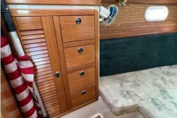 - The updated interior has an aft cabin with a large athwartship double berth, hanging locker and bureau. The forward cabin is comfortable and well ventilated and has a private entrance to the head. Cruisers love storage space and the Catalina 36 is renowned for it. There are ample drawers, lockers and bins for all your cruising provisions and gear.