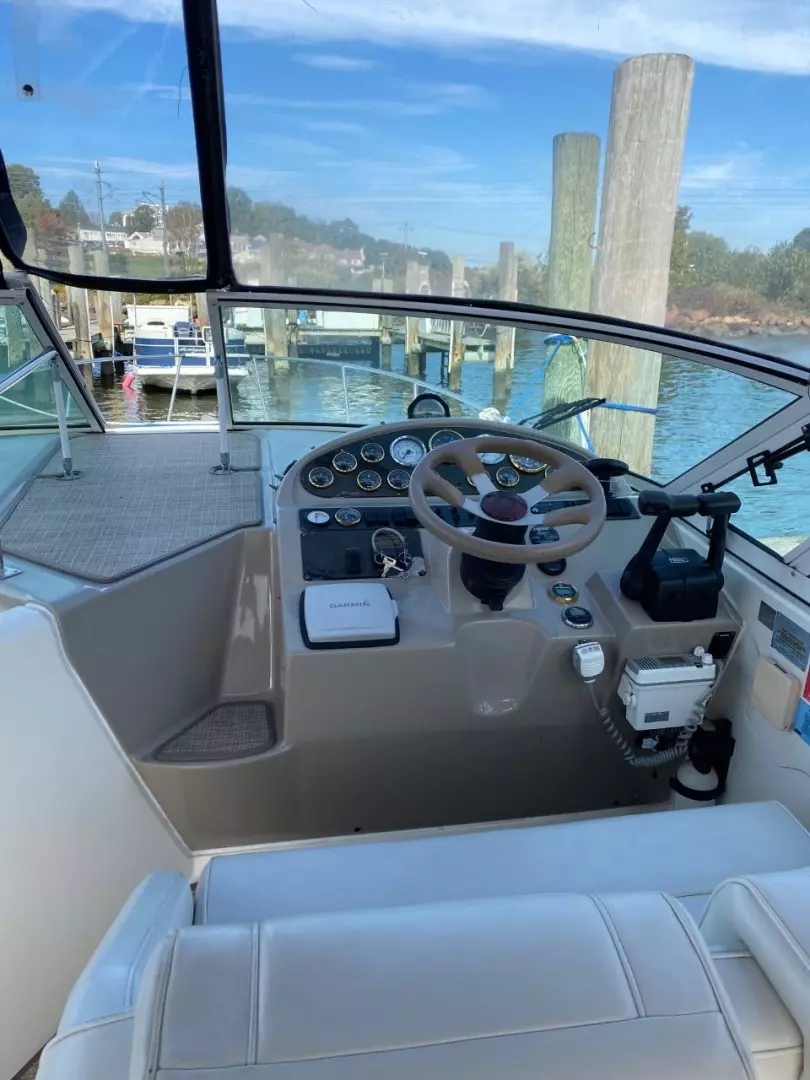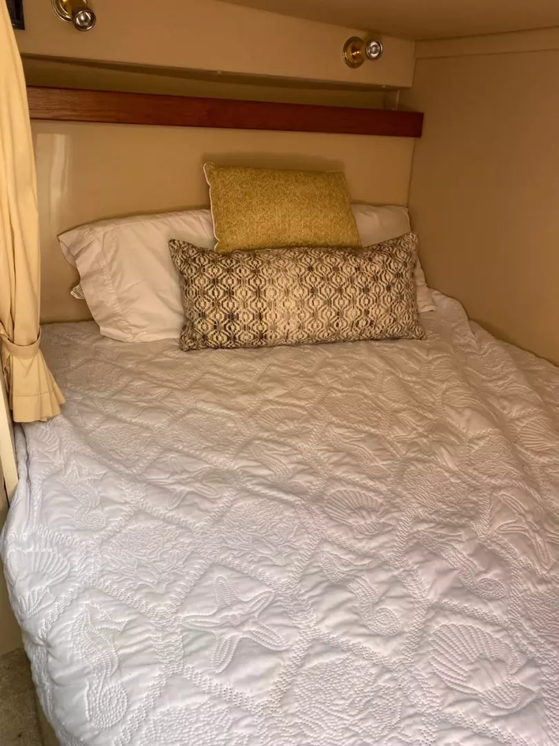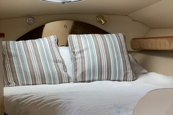 Notable Upgrades: Forward you have an offset double bed with storage beneath, hanging locker and a ventilation Hatch. Aft to starboard you have a u-shaped dinette area that converts. Aft to port is the spacious galley area followed by the enclosed head. Aft again from the dinette is the aft cabin with the other double bed. Up a couple of steps to the helm deck with the helm to starboard followed by forward and aft facing bench seats in the cockpit. A transom door to port leads out to the swim platform with ladder. |