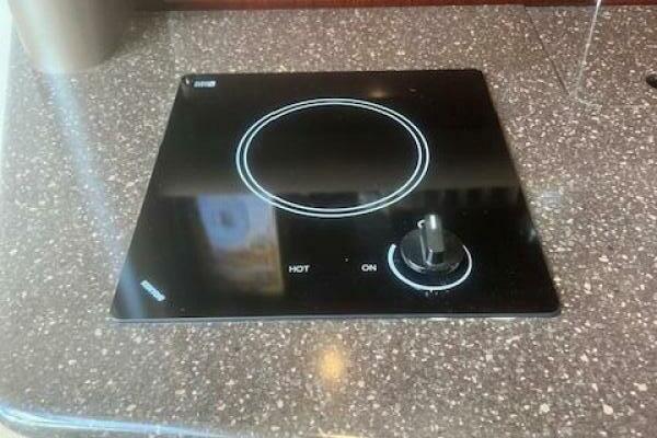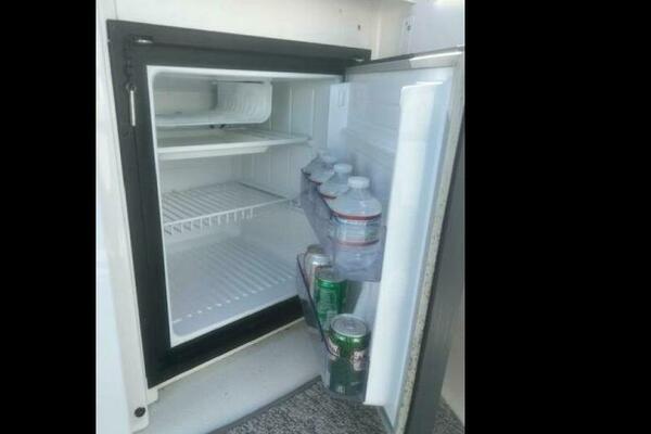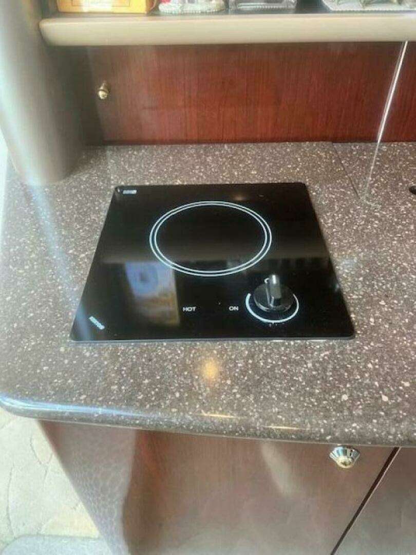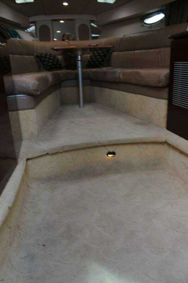 On deck, she’s designed for comfort and entertaining: a double helm bench, portside lounges, a wraparound cockpit settee with removable table, wet bar with fridge, sink and cooler, walk-through transom, oversized locker, and a swim platform with ladder. Below, the inviting interior offers a Galley with a stainless sink, fridge, cooktop, and Samsung microwave; a U-shaped dinette that converts to a forward V-berth; an aft double berth; and a full head with a shower.