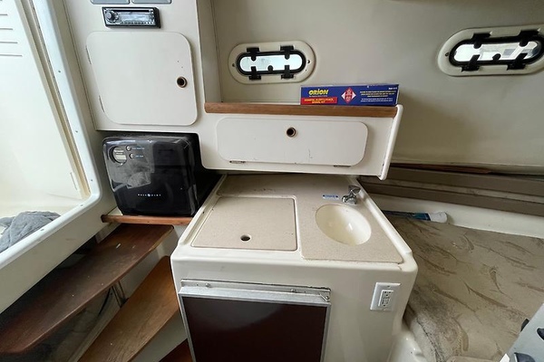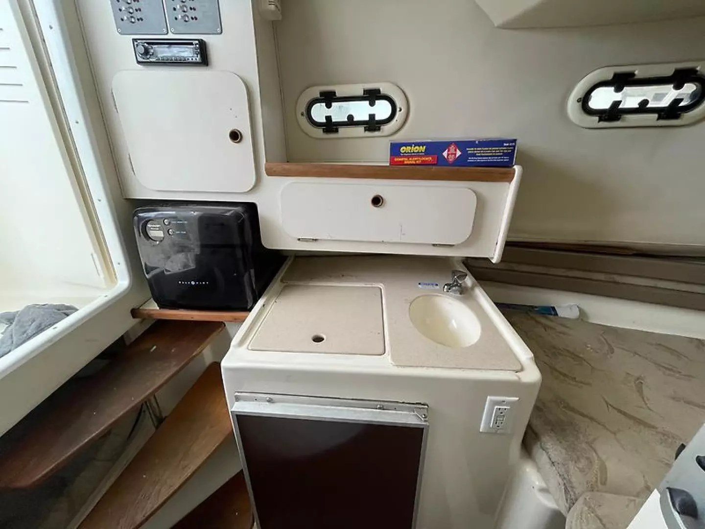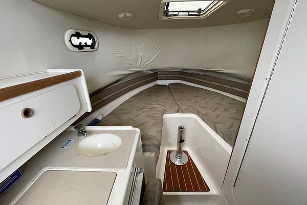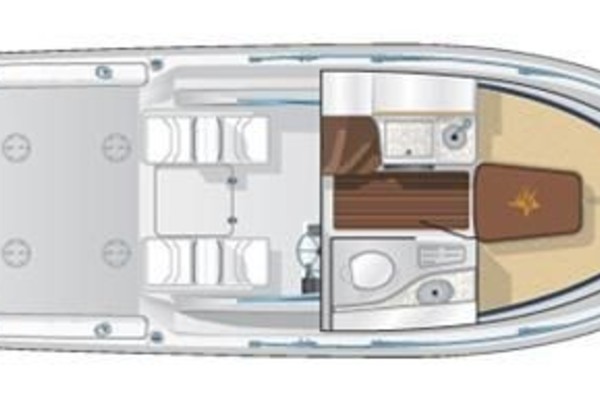 The Pursuit 2870 Walkaround is built to fish, yet replete with cruising comforts. It features backrests on the stern-facing seats and a tilting aft seat housing the 44-gallon fish box. The forward cabin is raked with a more angled, round-cornered windshield that adds style to her look. Twin Yamaha outboards and a unique hull design deliver a smooth, yet powerful ride. Rigged for landing the big game, the 2870 features a large, insulated cooler / fish box and livewell, four stainless steel rod holders, and additional storage under the gunwale. For total safety, non-skid can be found on all decks and wide walkways. Belowdecks, there is plenty of space and appointments, including a convertible V-berth with storage compartments, a galley, and an enclosed head with sink and pressure water. The cabin design has been created for maximum usable space and a host of conveniences, including optional air conditioning. Stylish fabrics and teak and holly flooring finish the cabin area in style.