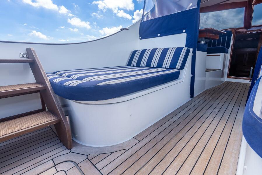 The 38 San Juan is a fun, sporty express equally ideal for day trippers or overnight adventurers. Built on a fiberglass hull reinforced with Kevlar, she is lightweight for her size while at the same time, handles reliably in rough seas. Her semi-enclosed Pilothouse provides protection from the elements and offers a 360-degree view of the surrounding waters from a beautiful teak helm station. Guests will enjoy both the convertible dinette and sun pads that stretch to the aft deck. Below deck accommodations include a V-Berth forward, a Queen berth midship, and a head with shower.