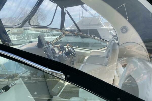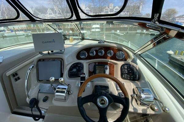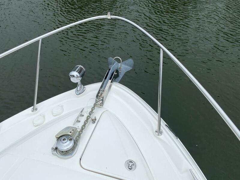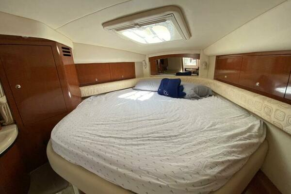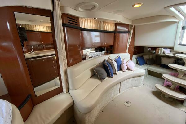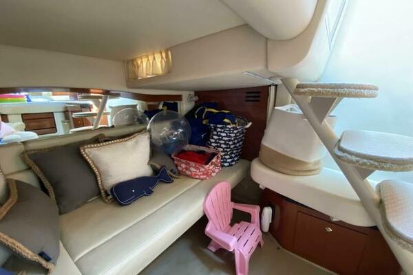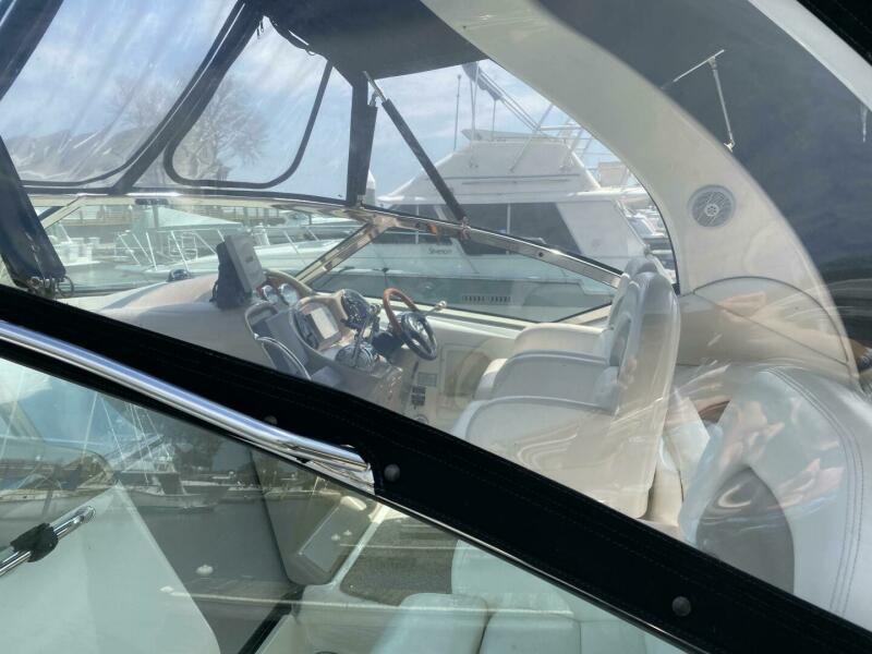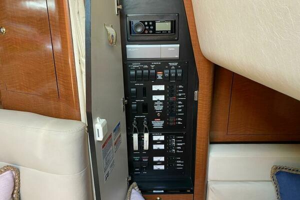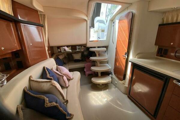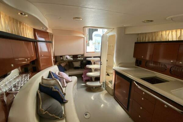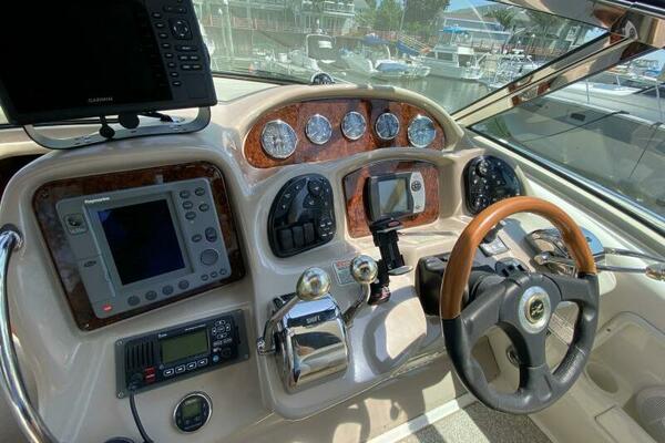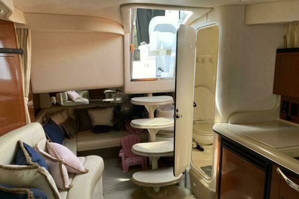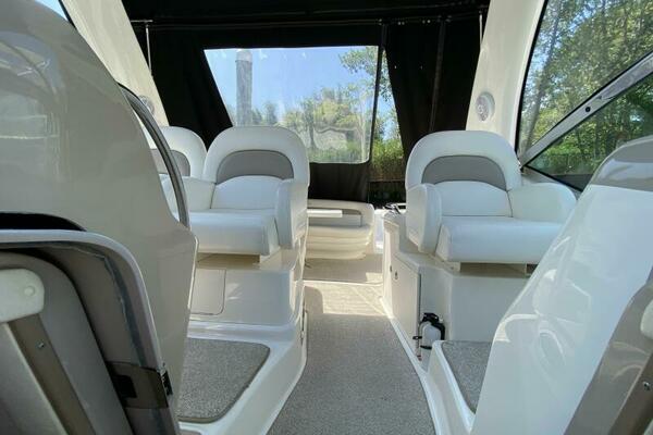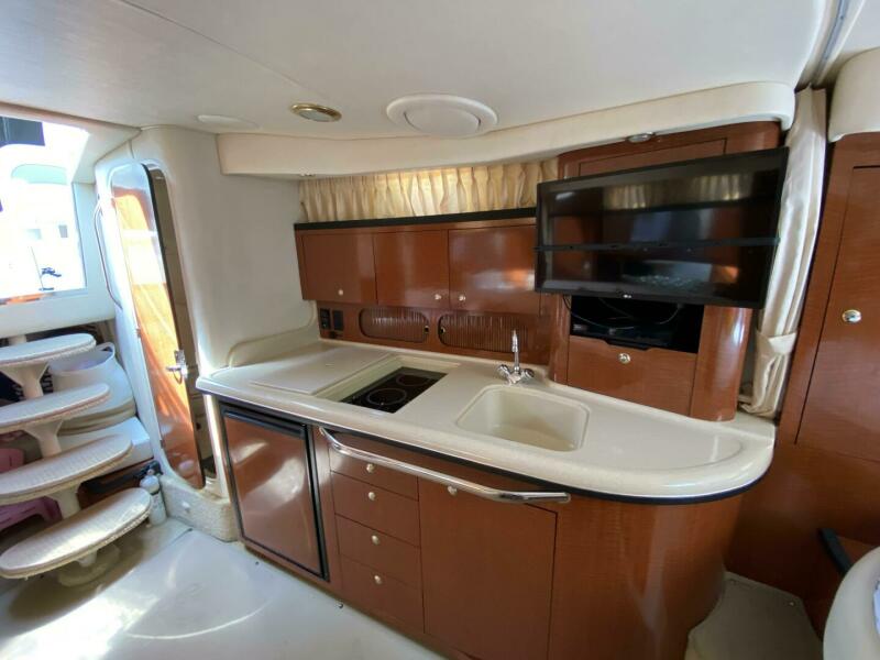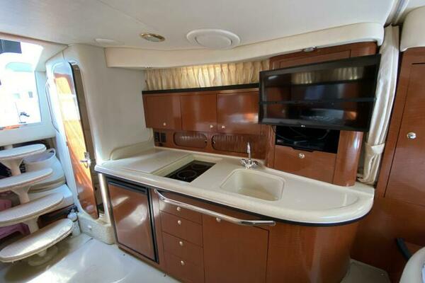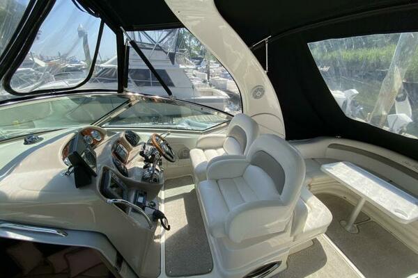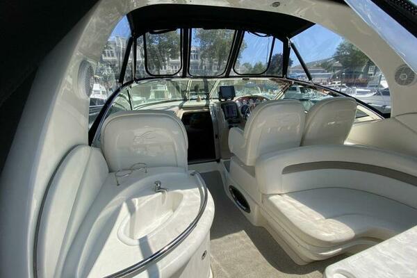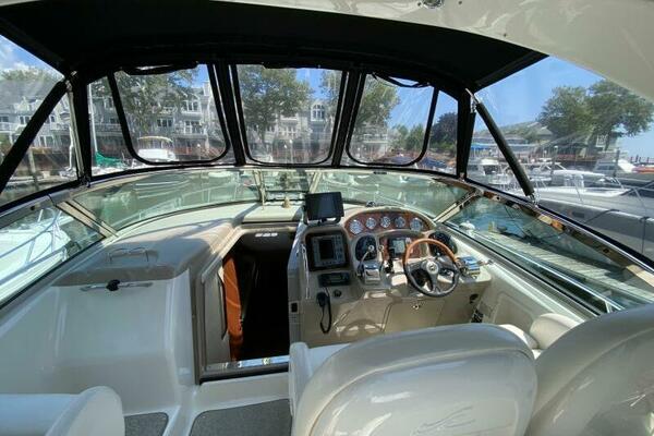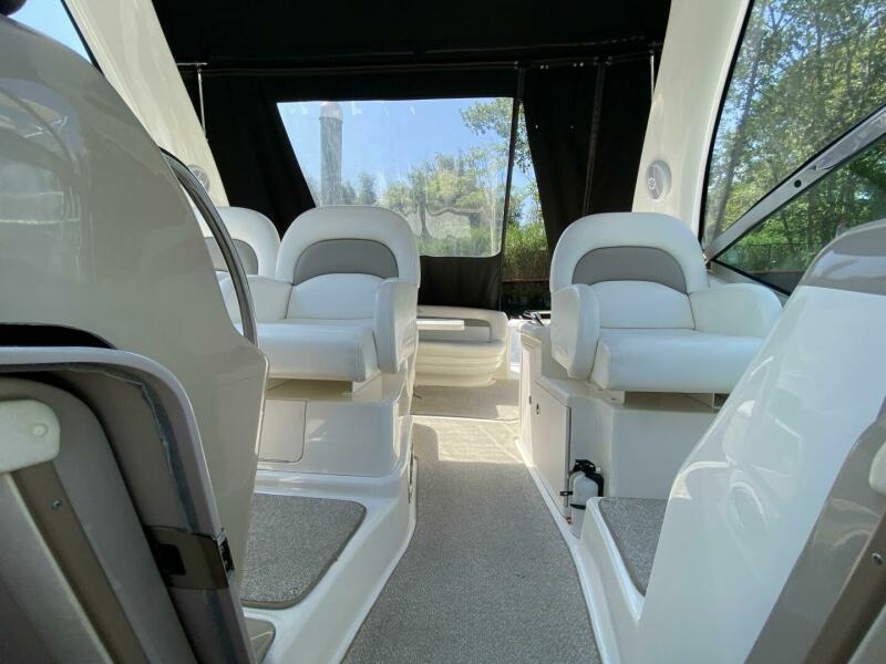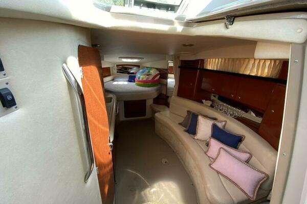 Powered by twin MerCruiser 8.1L 375hp V-drive inboards with 780 hours, handling is made even easier with a bow thruster, and she cruises easily at 28 kts. The unique cockpit layout has large U-shaped aft seating, portside bucket seat, wet bar, and helm/companion seats with armrests. Cabin features include island berth, curved sofa, large mid-cabin/conversation area, lots of storage and large-screen TV.