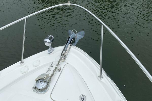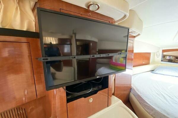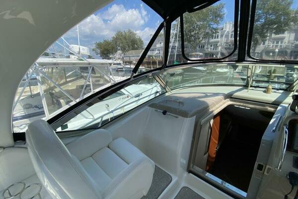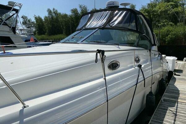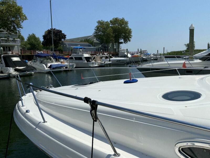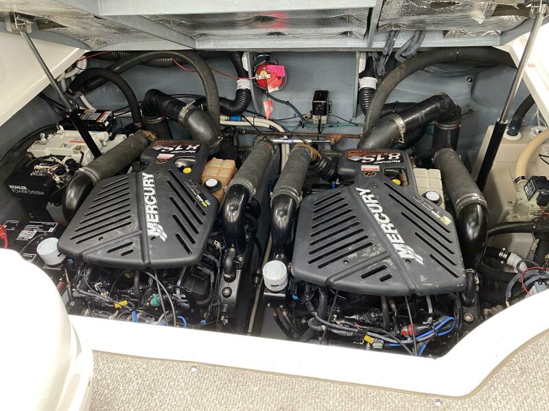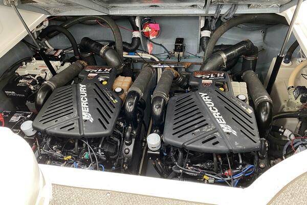 Powered by twin MerCruiser 8.1L 375hp V-drive inboards with 780 hours, handling is made even easier with a bow thruster, and she cruises easily at 28 knots. The unique cockpit layout has large U-shaped aft seating, a portside bucket seat, a wet bar, and helm/companion seats with armrests. Cabin features include an island berth, curved sofa, large mid-cabin/conversation area, lots of storage, and a large-screen TV.