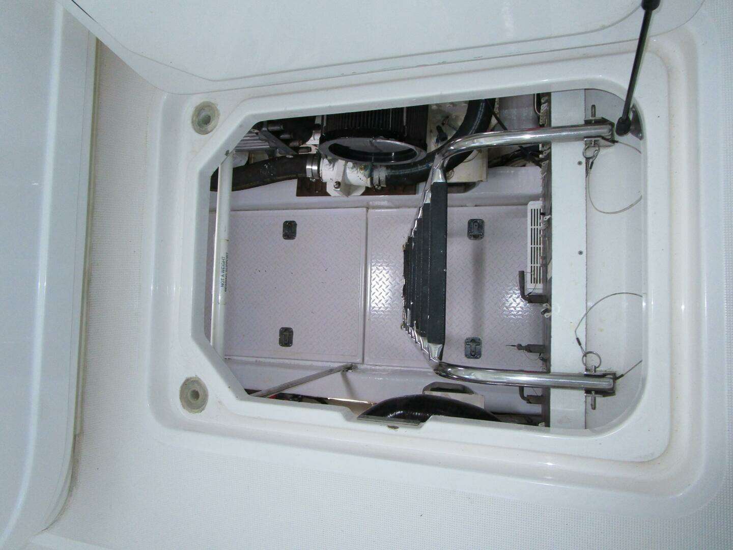 There is huge “garage style” storage (hydraulically operated) across the transom area for fenders, docking lines, cleaning supplies, diving and fishing equipment.