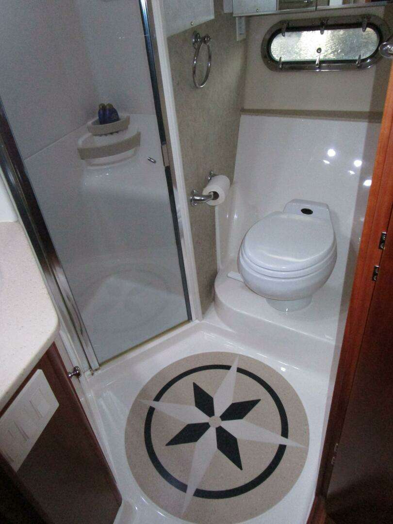 Also in the head are two overhead LED lights, an opening stainless steel porthole and two mirrored cabinets over the porthole. The sole has an attractive Compass Rose Corian inlay. The bulkheads are wallpapered. There is an A/C outlet and an exhaust vent for this area.
